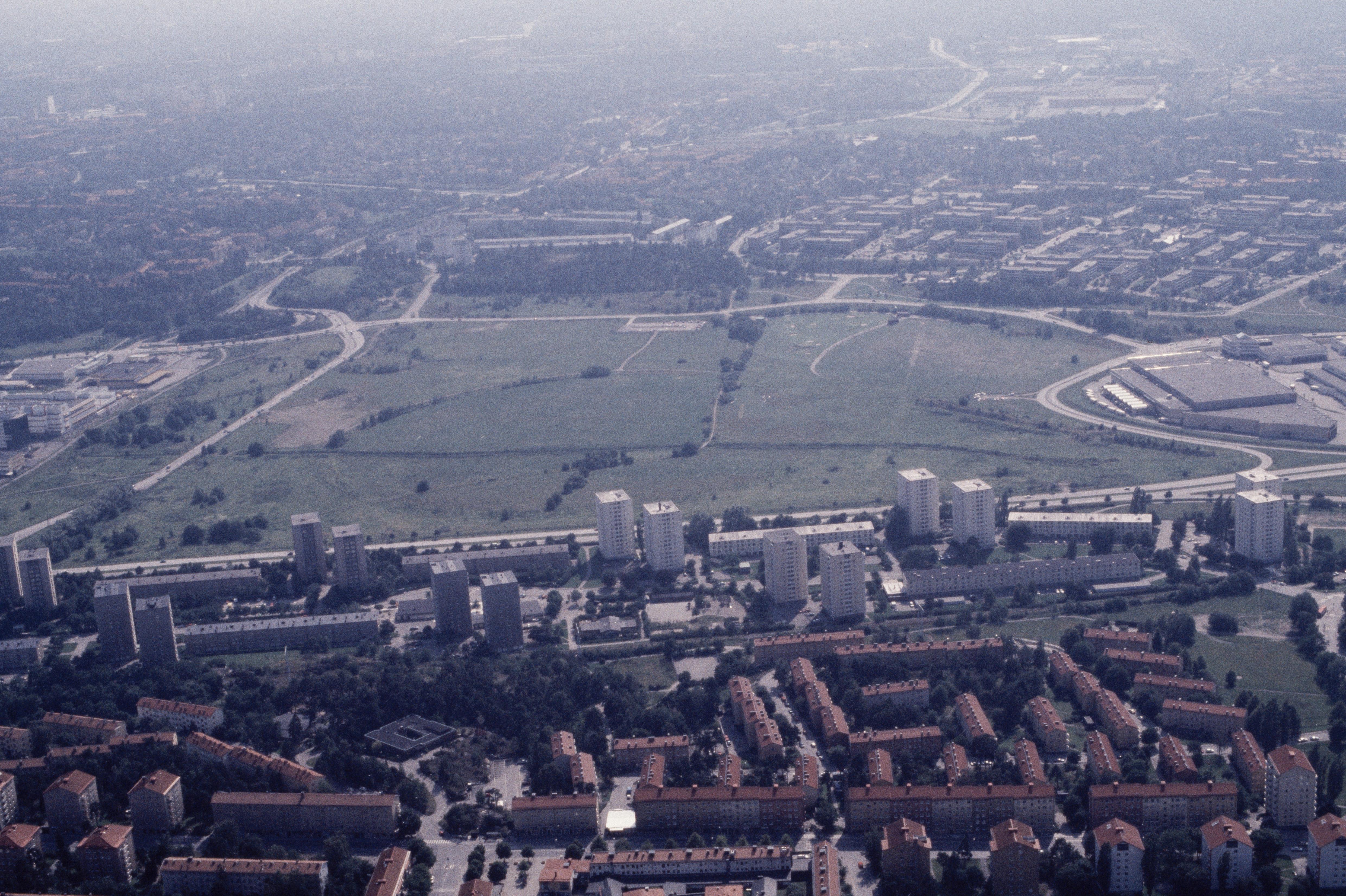 Beskrivning: Årsta. Vid bildens mitt Årstafältet med golfbana och Göta landsväg RAÄnr Brännkyrka 34:1. (NB! Tidigare var området i Brännkyrka socken). Bilden är tagen mot (väderstreck): SV