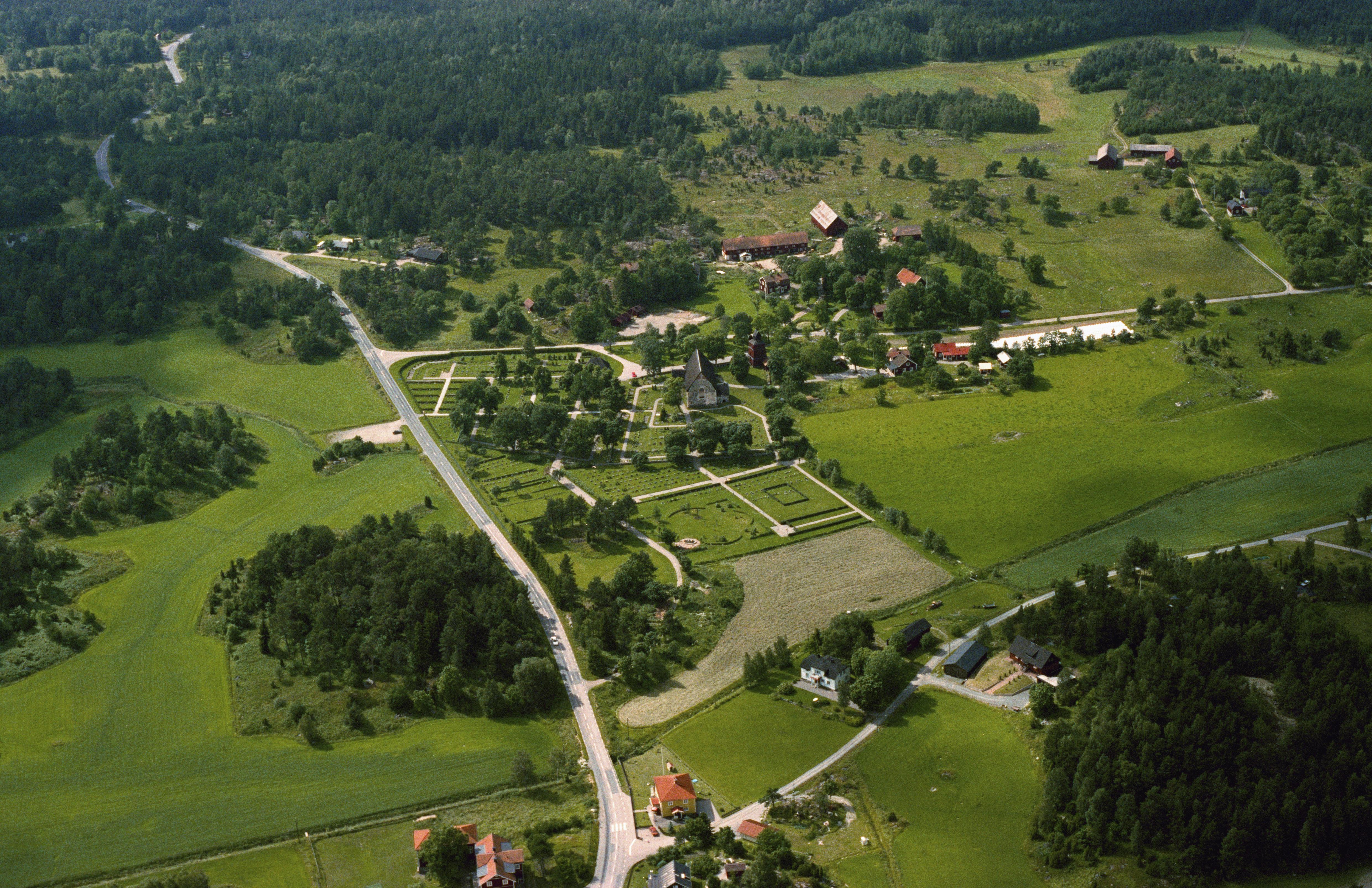 Beskrivning: Häverö kyrka och kyrkby. Gravfält RAÄnr Häverö 55:1 i bildens högra kant. Bilden är tagen mot (väderstreck): V