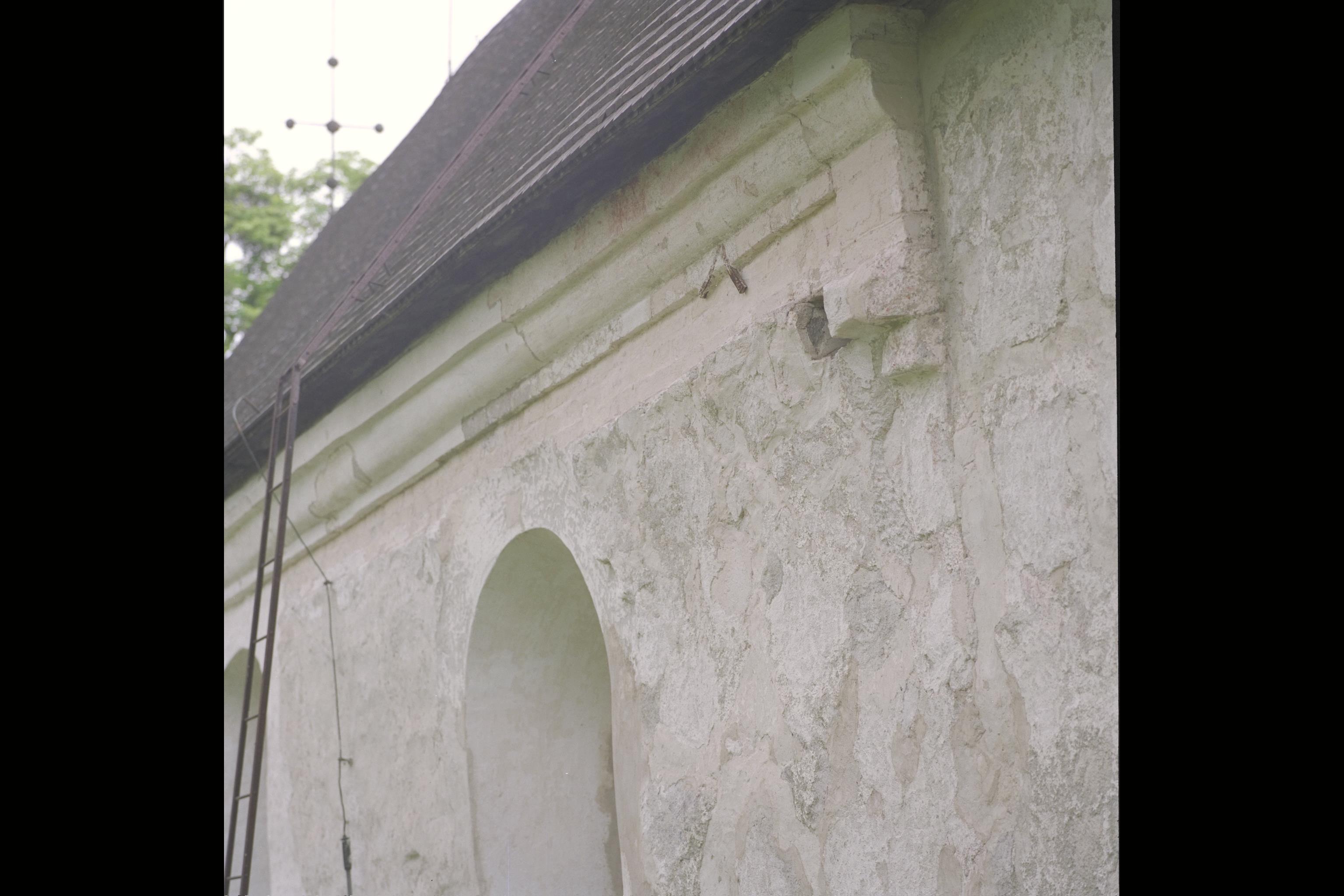 N fasaden, stötfog mellan långhus och västparti som saknar gesims.