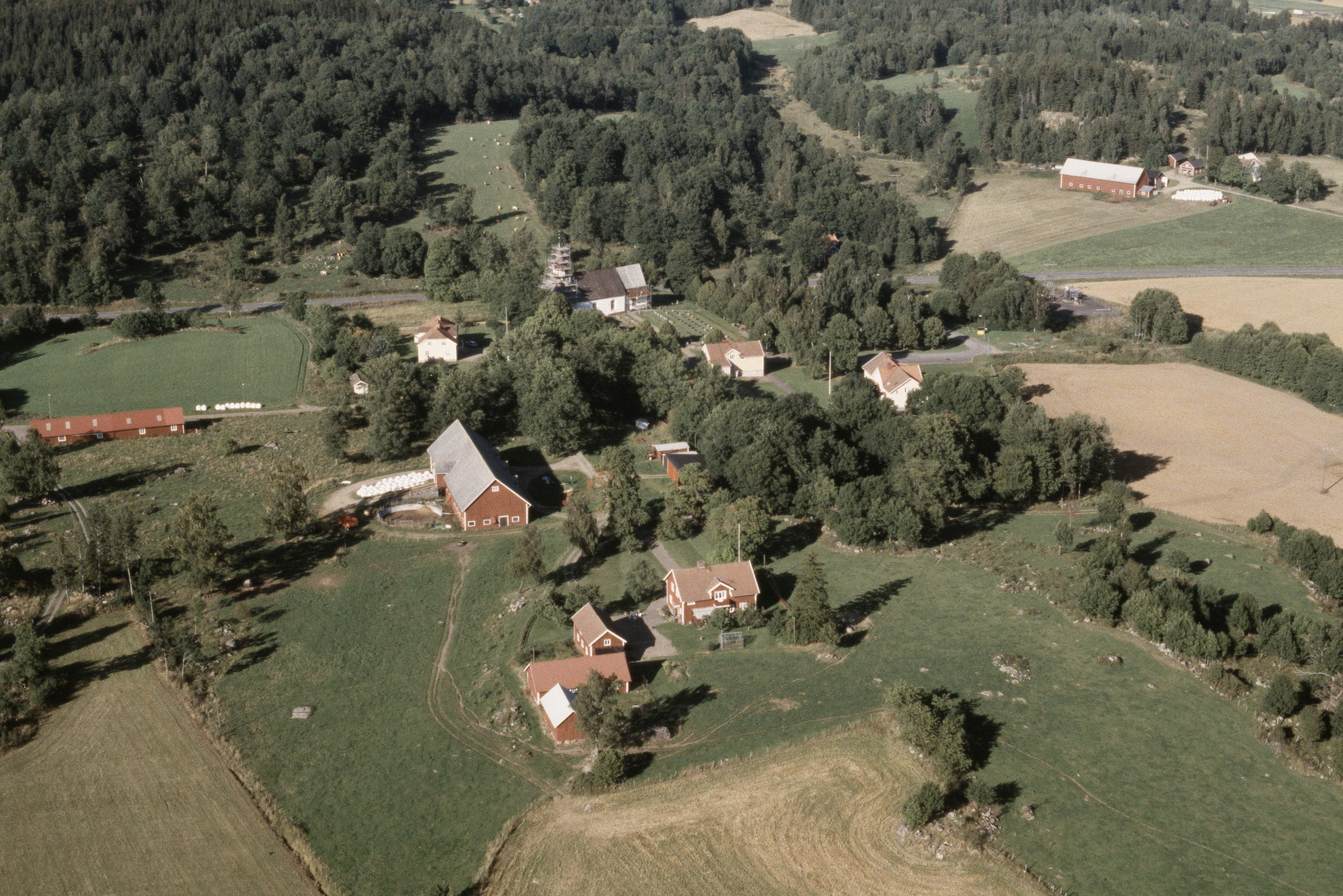 Beskrivning: Ölmstads by. Lindholmen och Klockaregården. Ölmstads kyrka över bildens mitt. Bilden är tagen mot (väderstreck): NO