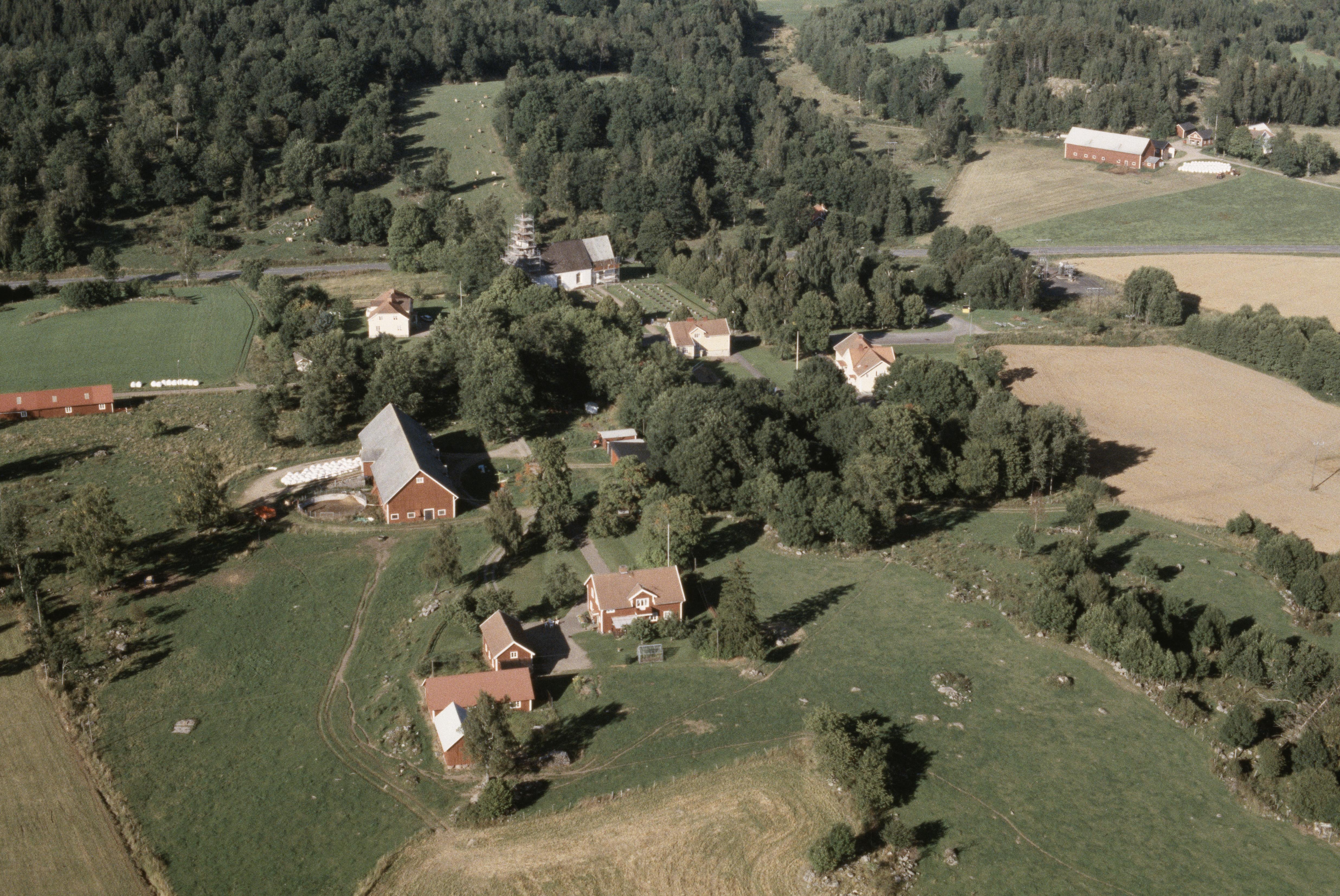 Beskrivning: Ölmstads by. Lindholmen och Klockaregården. Ölmstads kyrka över bildens mitt. Bilden är tagen mot (väderstreck): NO