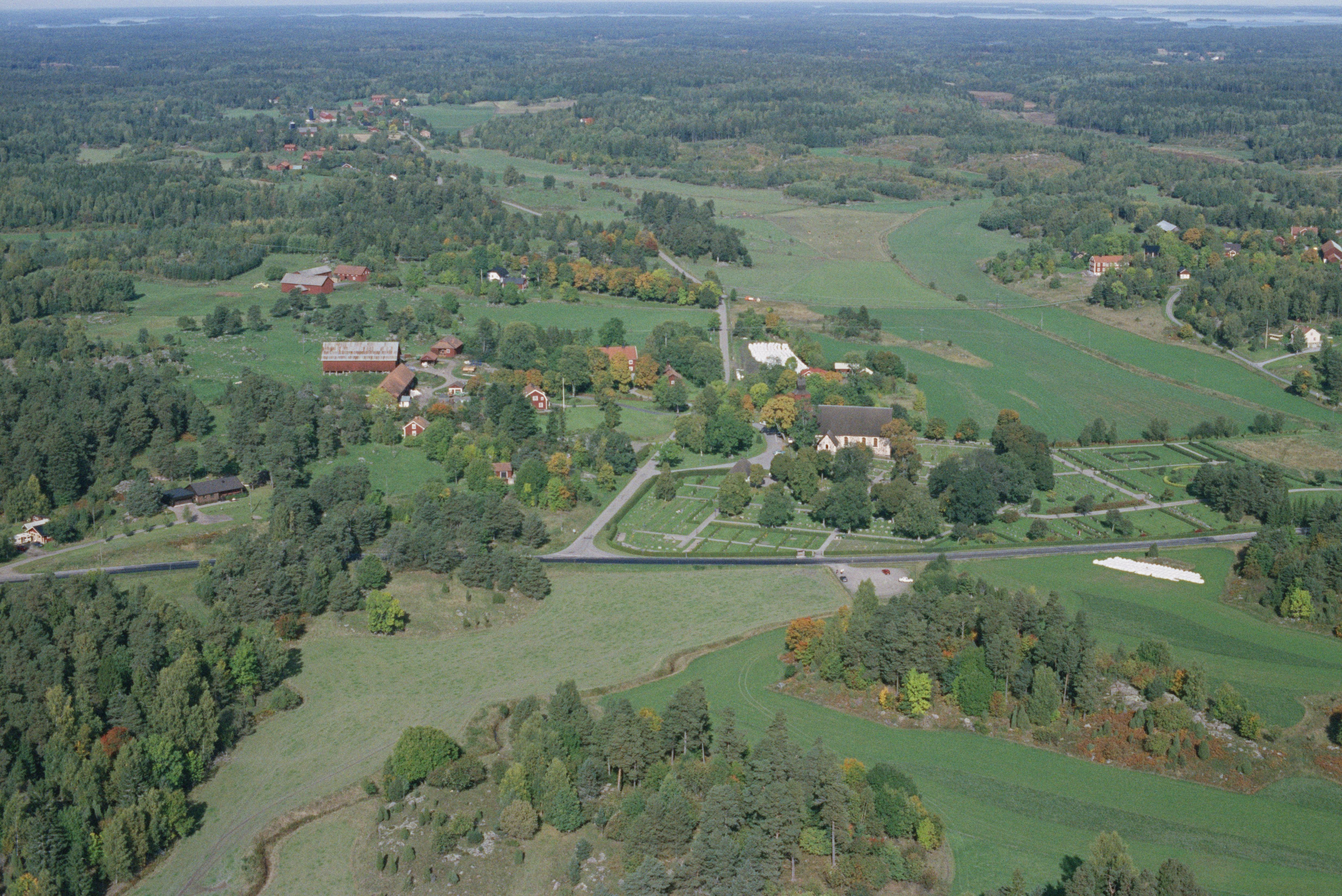Beskrivning: Häverö kyrka och kyrkby över bildens mitt. Gravfält RAÄnr Häverö 55:1 över bildens mitt. Bilden är tagen mot (väderstreck): NNV