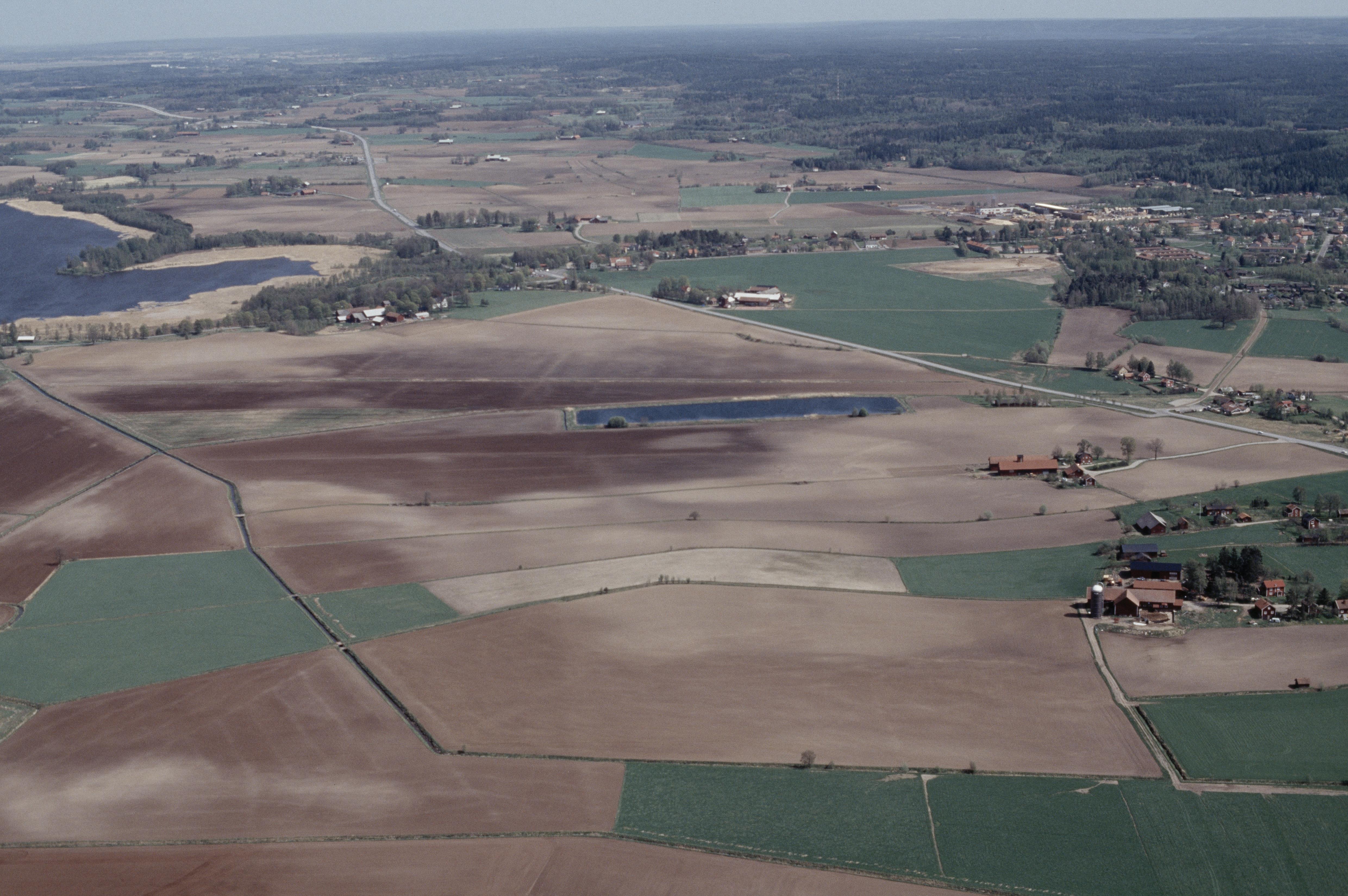 Beskrivning: Vibyslätten sydväst om Vibysjön, innan vägbygge av E3 / E20. Bytomt RAÄnr Viby 348 m.fl. Bilden är tagen mot (väderstreck): Ö