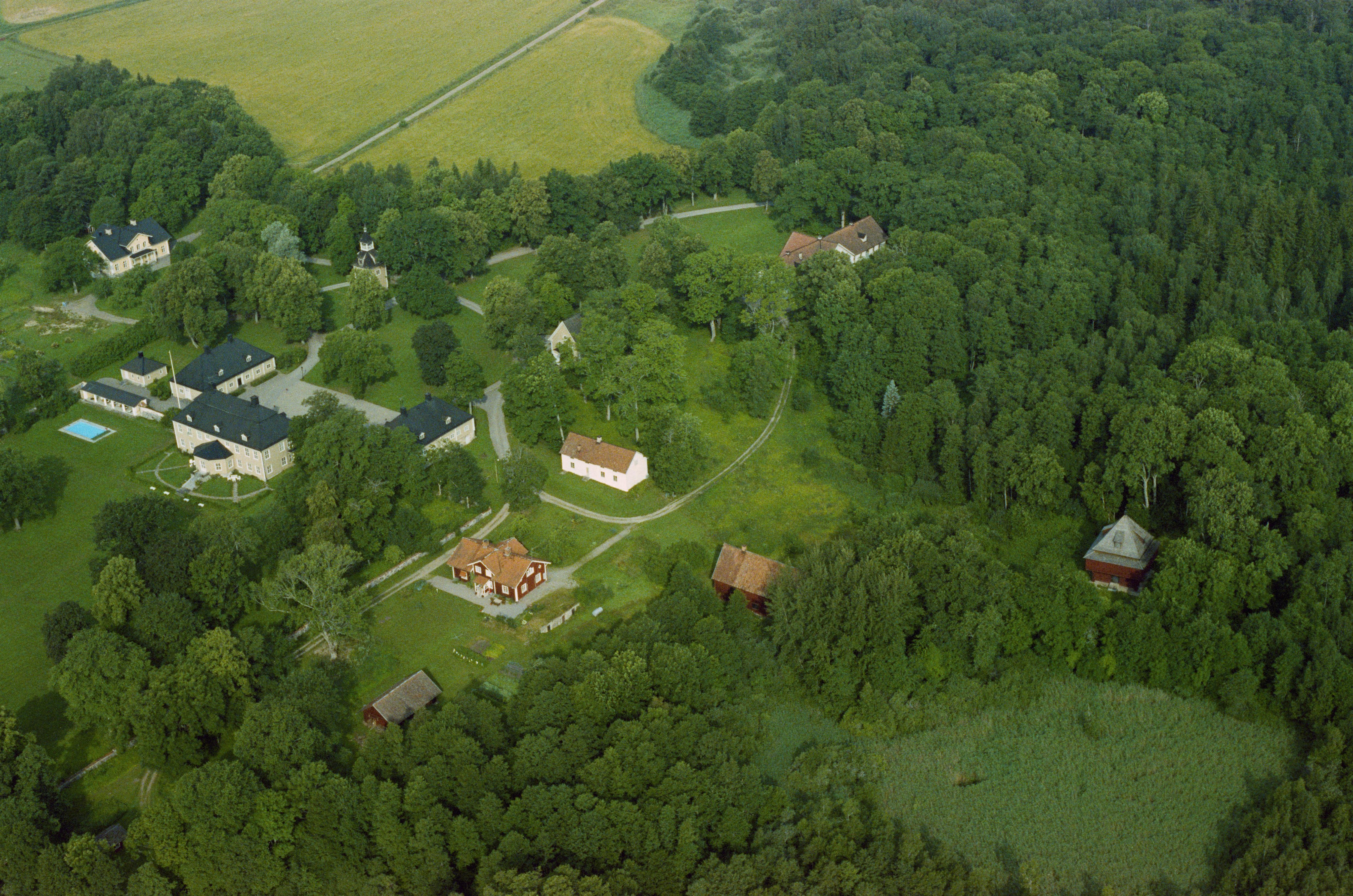Beskrivning: Bystads herrgård fastighet Bystad 1:7. Fatbursbyggnad nere till höger. Bilden är tagen mot (väderstreck): NV