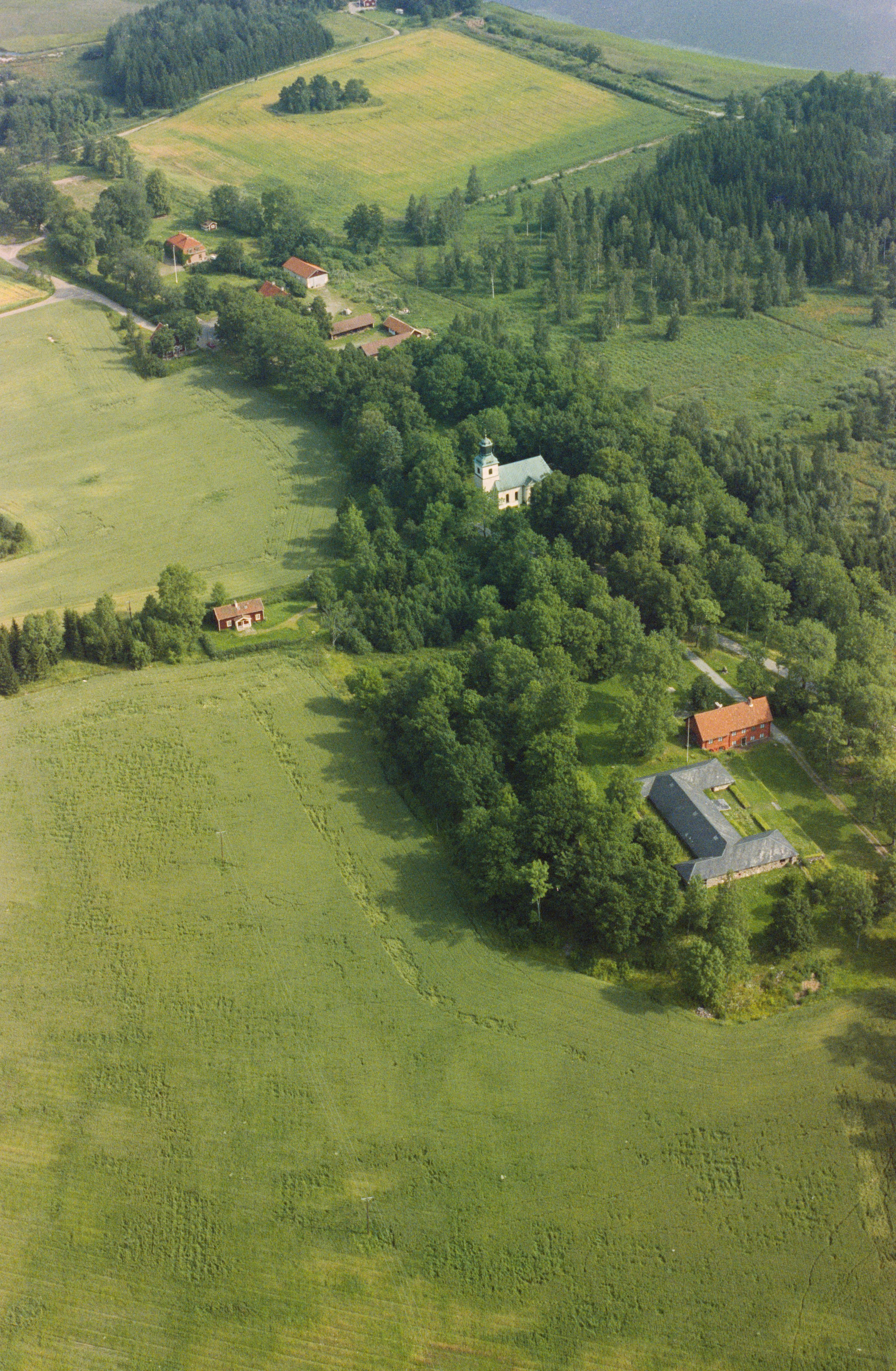 Beskrivning: Slottsruin Kägleholm RAÄnr Ödeby 8:1 (under grått skiffertak) och Ödeby kyrka. I bildens övre del Kägleholms herrgård / säteri vid sjön Väringen. Bilden är tagen mot (väderstreck): NO