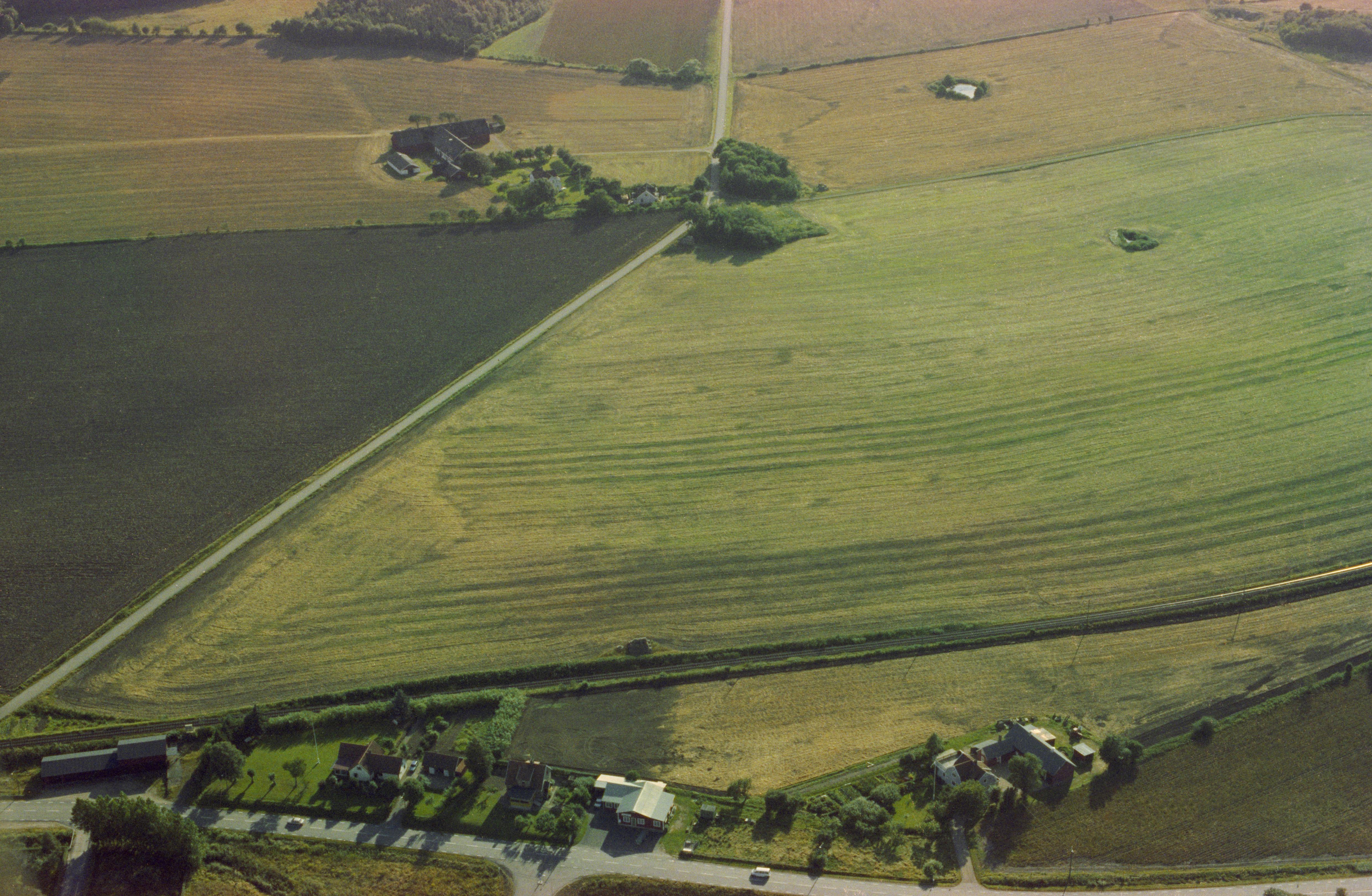 Beskrivning: Väg E6 ska byggas här vid området Broen, sydväst om Heberg, vid gränsen mellan socknen Skrea och Årstad. Bilden är tagen mot (väderstreck): SSV