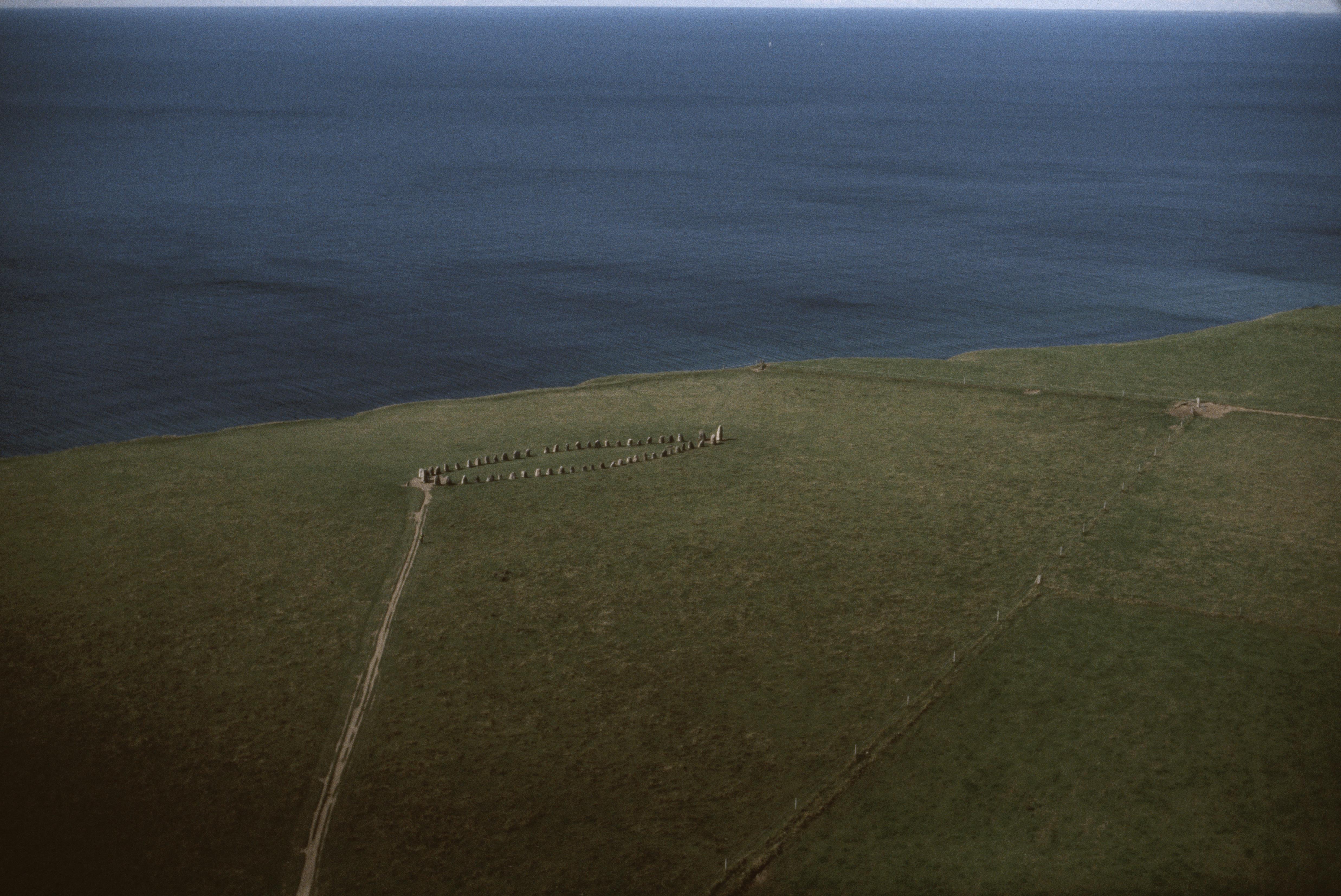 Beskrivning: Skeppssättningen Ales stenar RAÄnr Valleberga 20:1 vid Kåseberga. Bilden är tagen mot (väderstreck): V