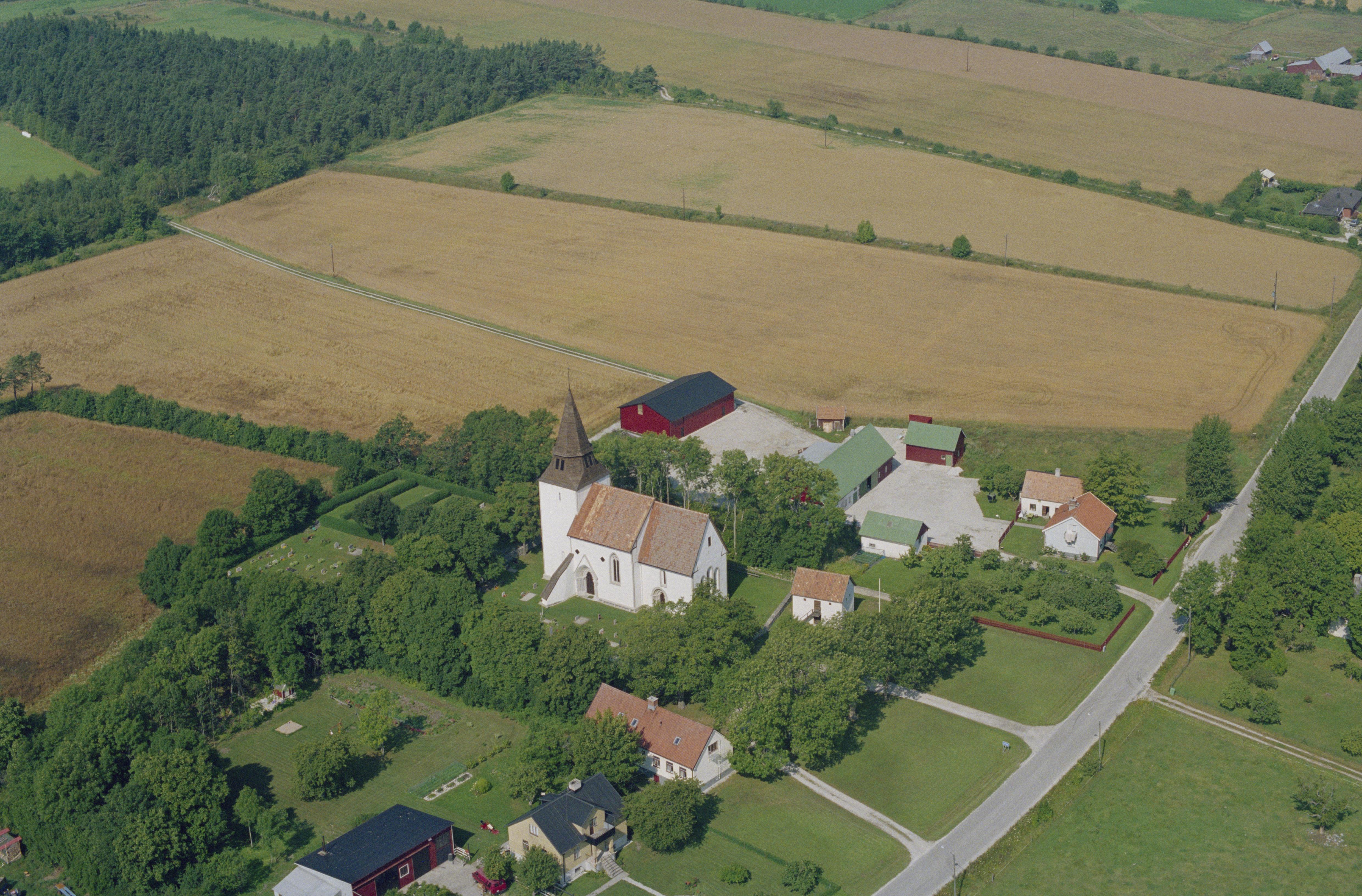 Beskrivning: Boge kyrkby. Boge kyrka till vänster om bildens mitt. Uppe till vänster boplats RAÄnr Boge 136. Bilden är tagen mot (väderstreck): NV
