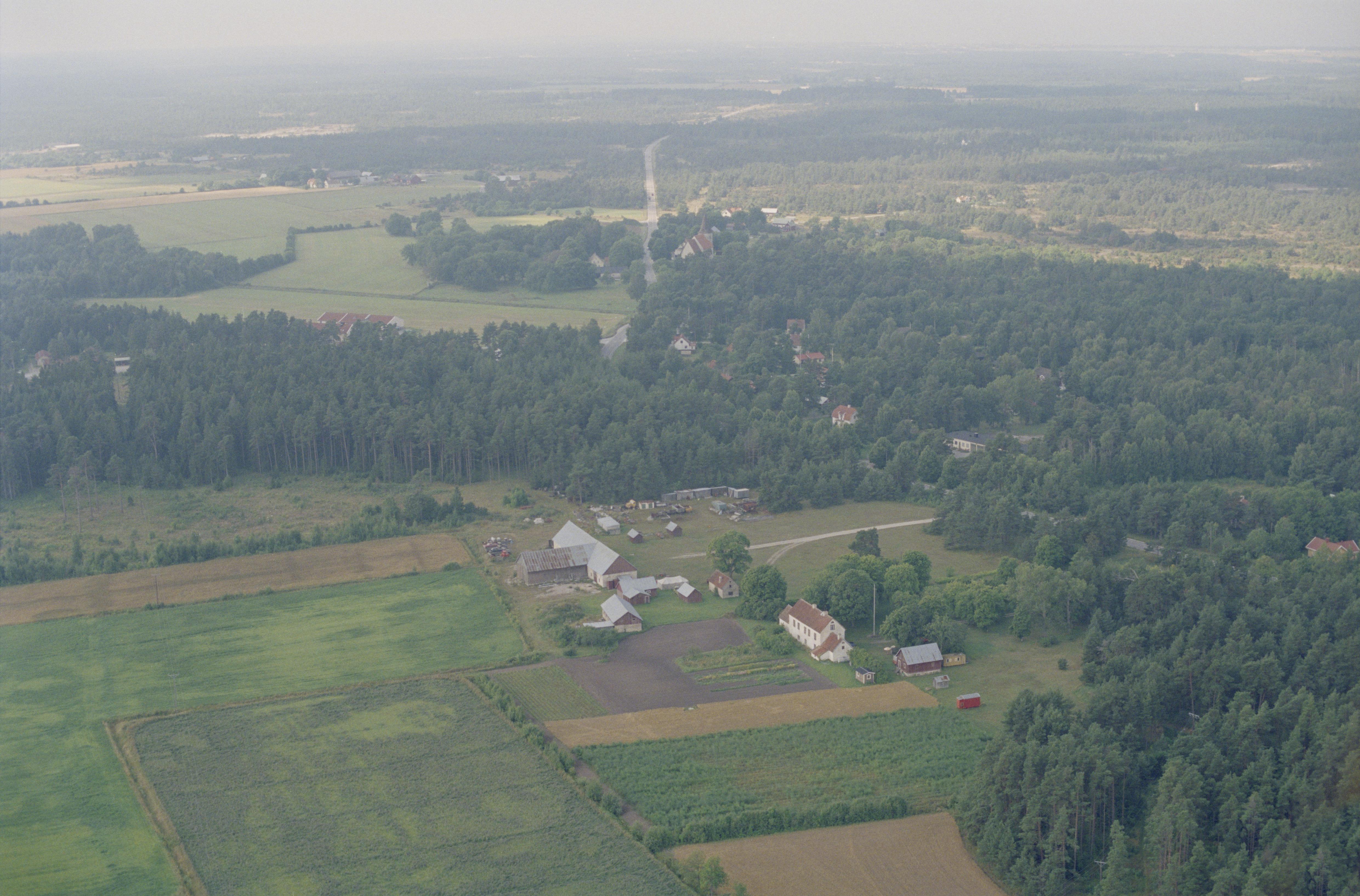 Beskrivning: Under bildens mitt gården Duss. Området Duss RAÄnr Bro 137:1 har tidigare utpekats som plats för myntprägling / mynthus. Bro kyrka i över bildens mitt. Bilden är tagen mot (väderstreck): SV