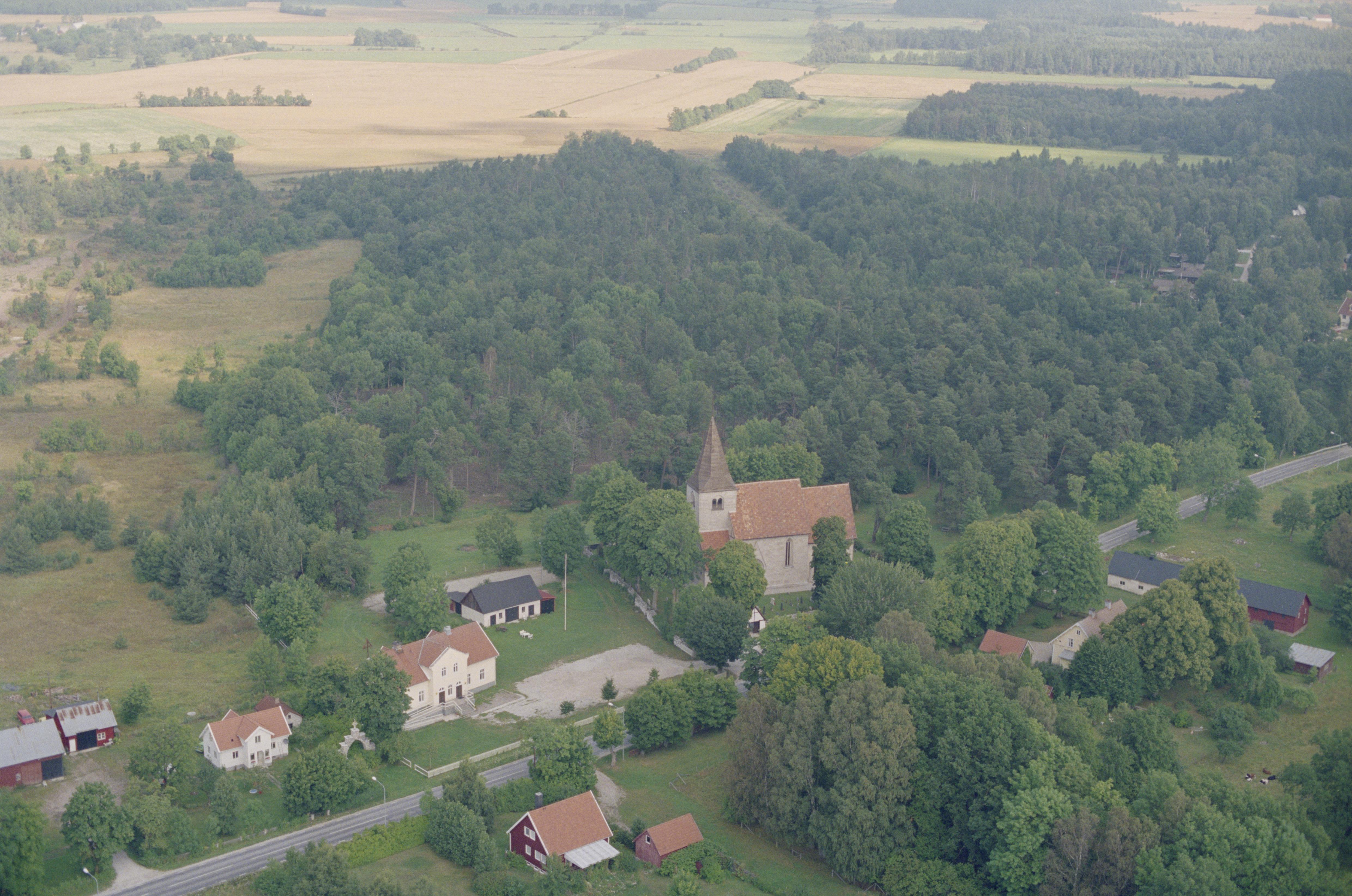 Beskrivning: Bro kyrkby. Bro kyrka i bildens mitt. I skogen till höger om kyrkan hägnad RAÄnr Bro 98:1. Bilden är tagen mot (väderstreck): NNO