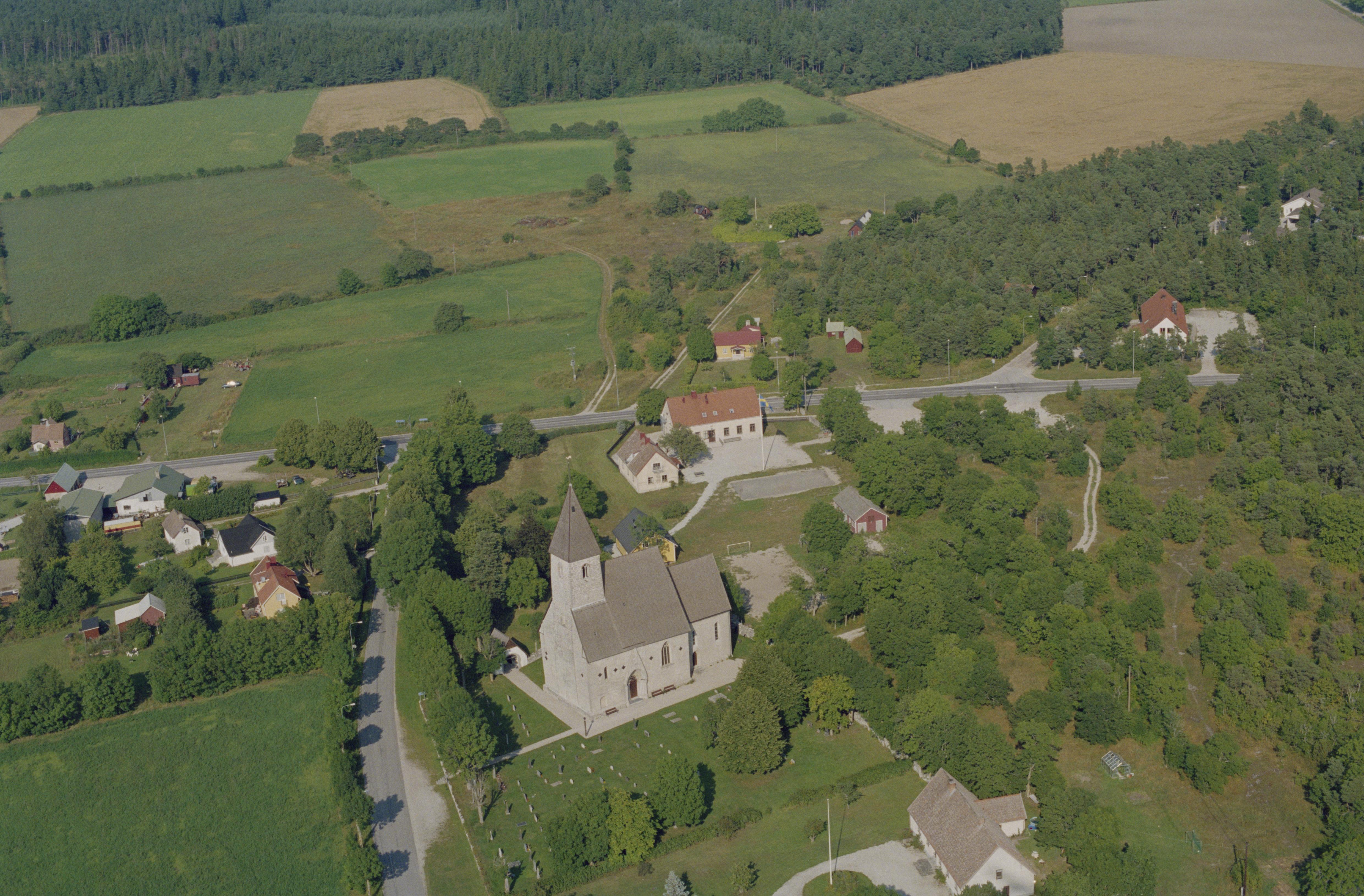 Beskrivning: Endre kyrkby. Endre kyrka och Endre skola över bildens mitt. Tilll höger om kyrkan en sten med tradition RAÄnr Endre 61:1. Bilden är tagen mot (väderstreck): NNO