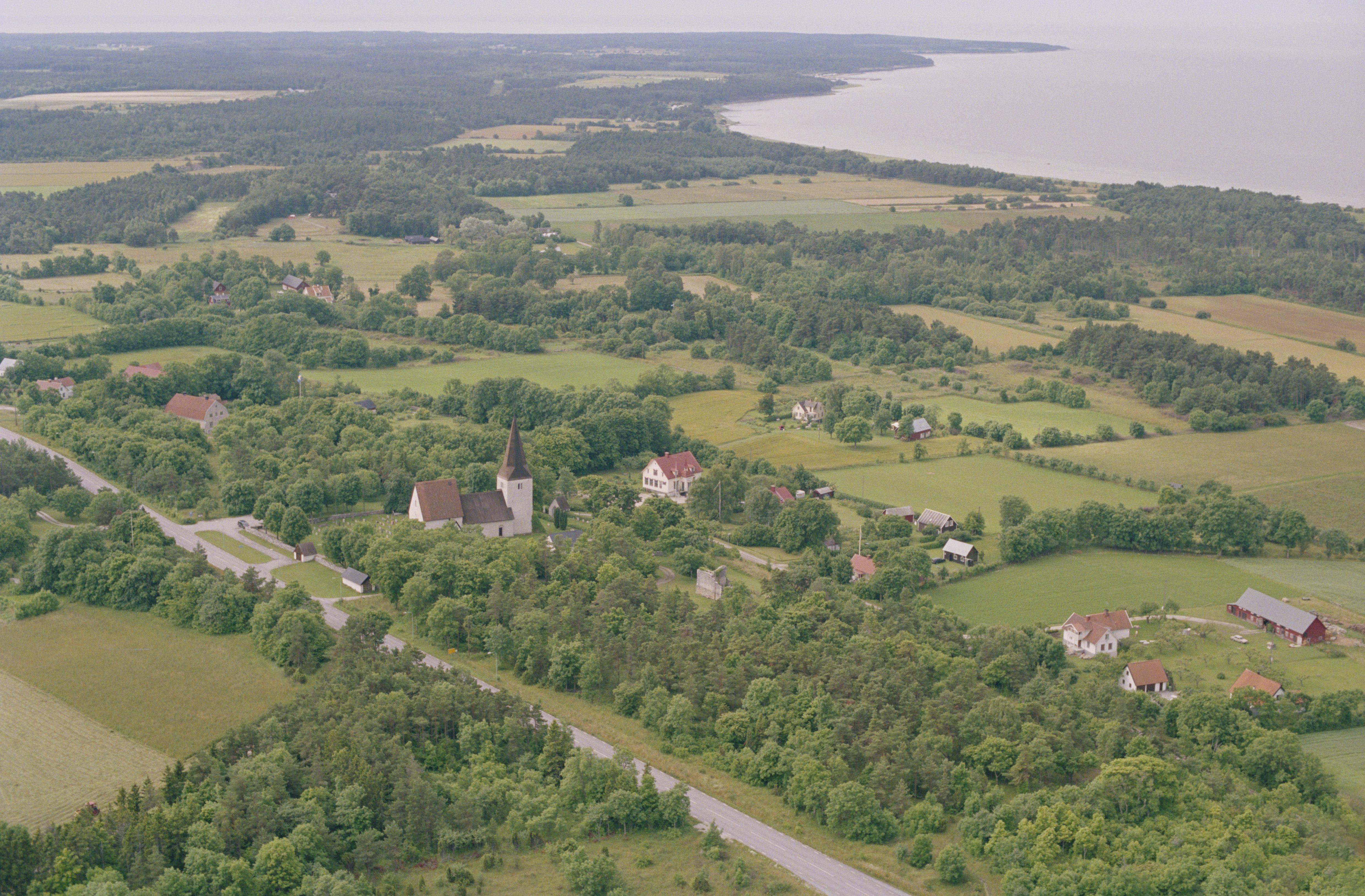 Beskrivning: Fröjels kyrka och kyrkby vid bildens mitt. Vid kyrkan kastal (ruin) RAÄnr Fröjel 11:1. Skansudd i Eksta socken i bildens övre kant. Bilden är tagen mot (väderstreck): SV
