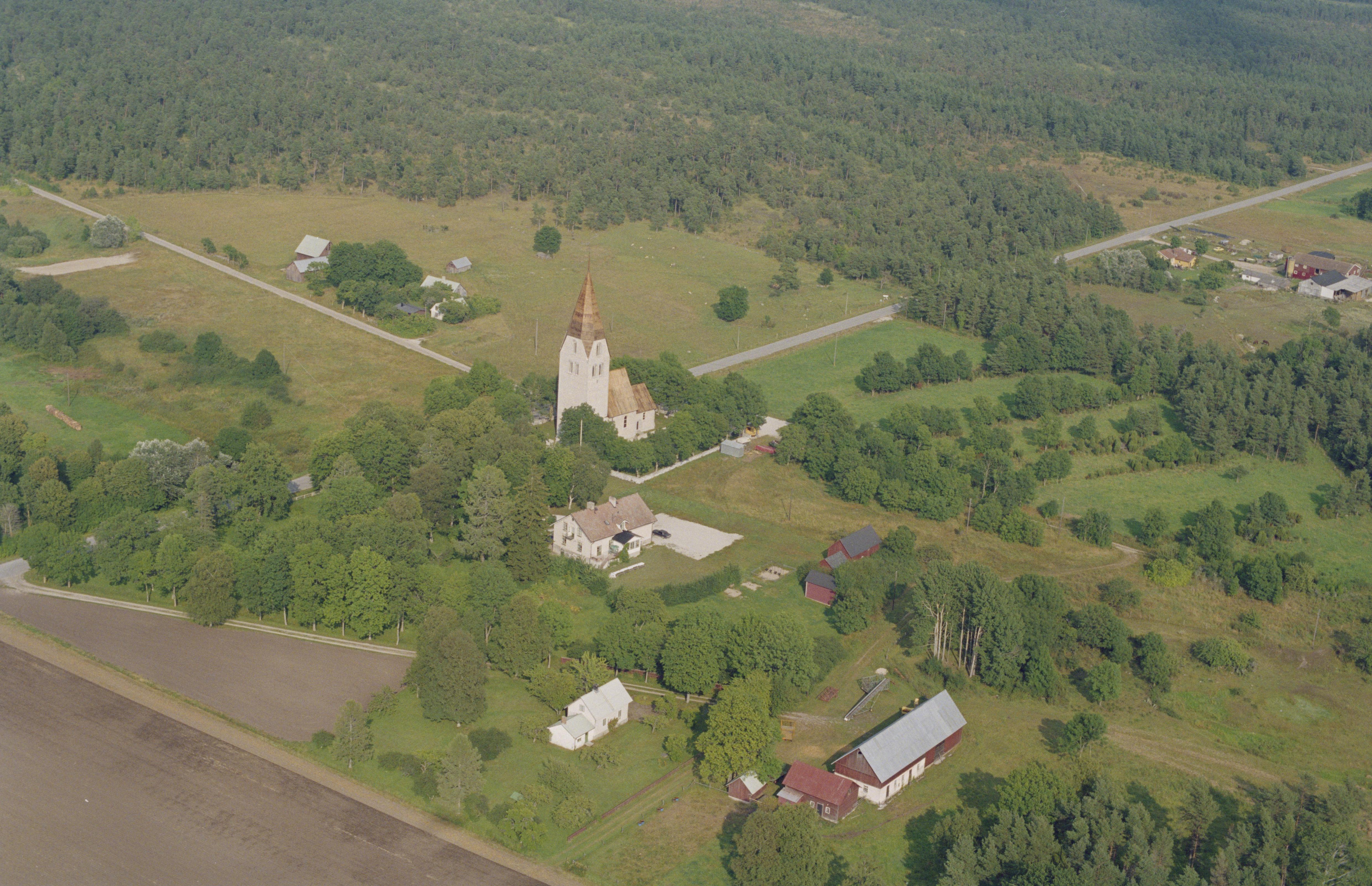Beskrivning: Ganthems kyrkby. Ganthems kyrka i bildens mitt. Vid kyrkan stensättningar RAÄnr Ganthem 64:1-3. Bilden är tagen mot (väderstreck): NO