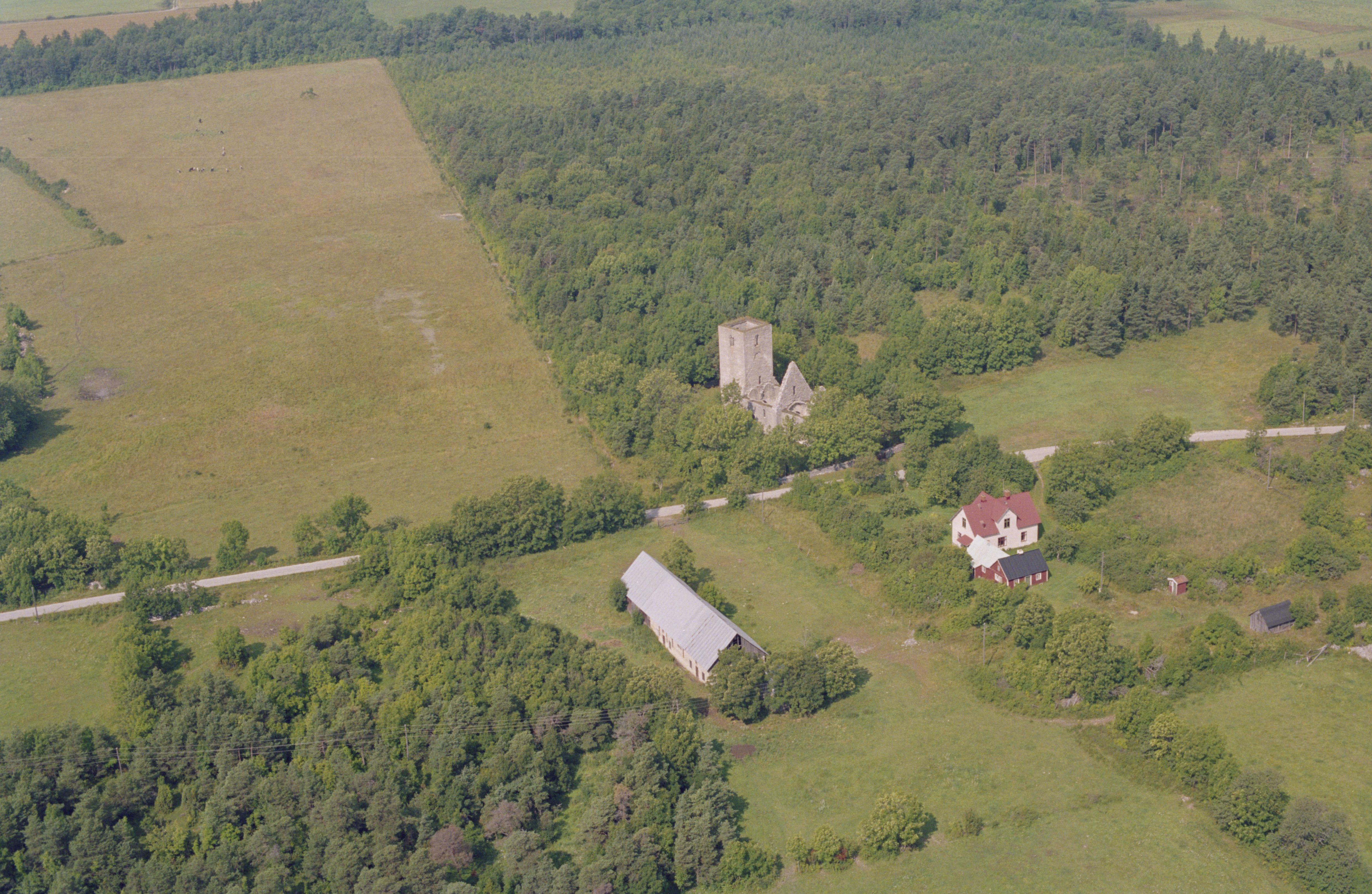 Beskrivning: Kyrkoruinen Ganns ödekyrka RAÄnr Lärbro 220:1 vid bildens mitt. I skogen till höger i bildens övre del färdväg Lärbro 221:1. Bilden är tagen mot (väderstreck): NV