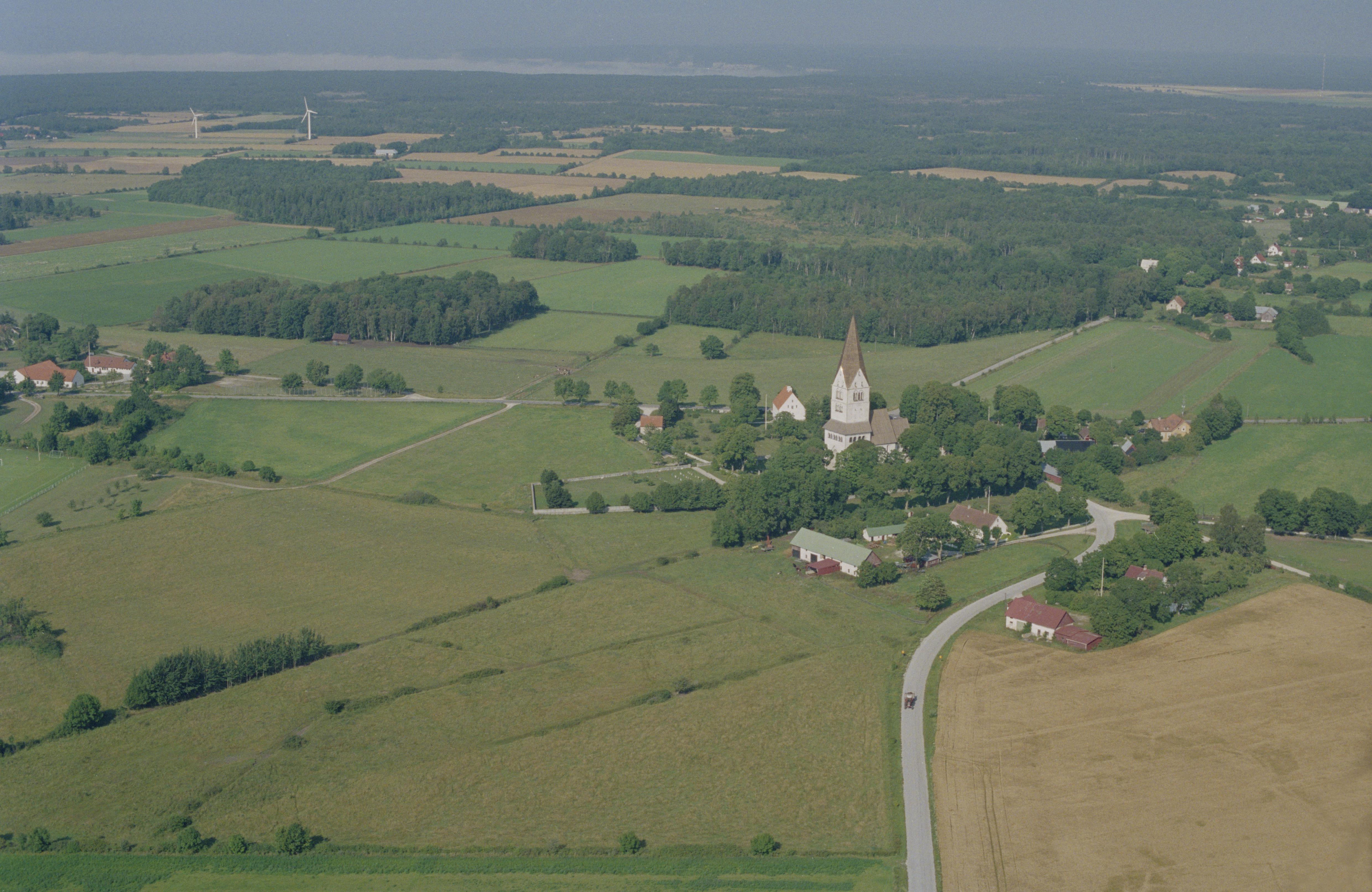 Beskrivning: Stenkyrka kyrkby. Stenkyrka kyrka till höger om bildens mitt. Vid kyrkan gravfält RAÄnr Stenkyrka 247. Bilden är tagen mot (väderstreck): NO