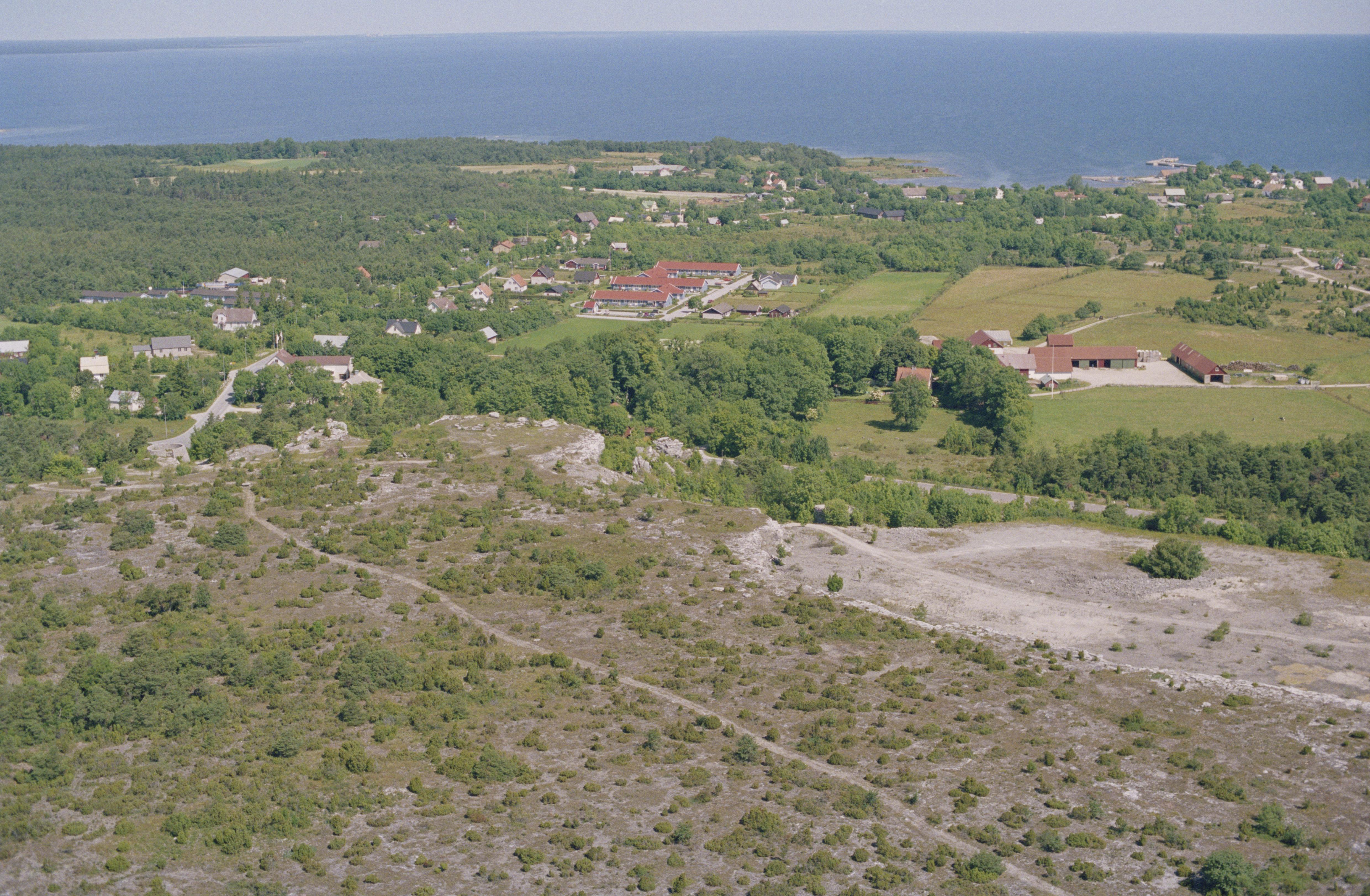 Beskrivning: I bildens nedre del kalkbrottet Gutenviksklint på Östergarnsberget i området norr om Gutenviks. I brottet kalkugnslämningar RAÄnr Östergarn 45:1 och 46:1. I bildens övre del småorten Katthammarsvik. Bilden är tagen mot (väderstreck): NNO