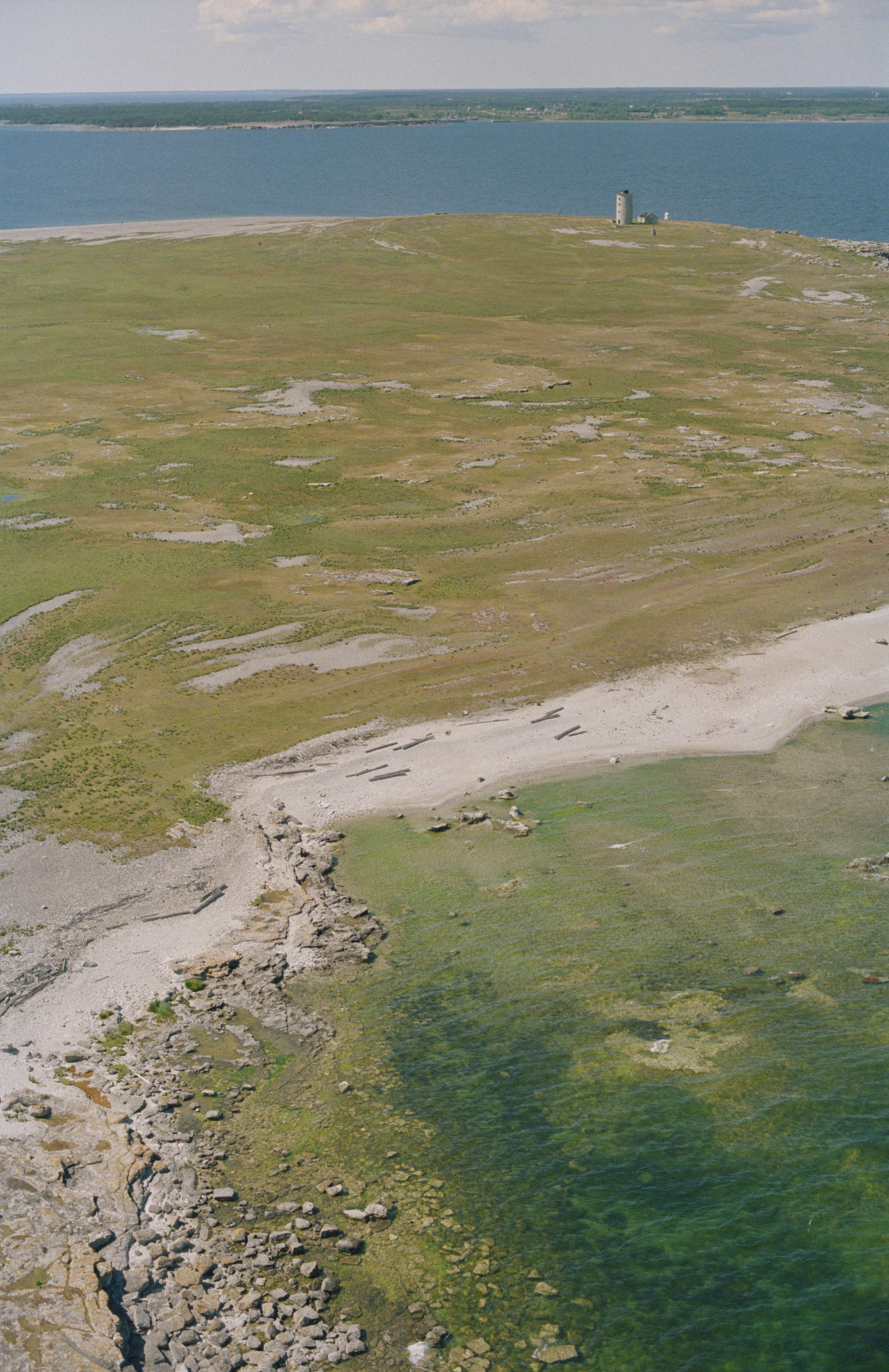 Beskrivning: Ön Östergarnsholm har fyra fyrar (tre syns i bildens övre del). Östergarns gamla fyr med provisoriska stenkolsfyren över bildens mitt. Dessa två är byggda på 1800-talet och är byggnadsminnen. De andra två är byggda på 1900-talet. Gamla fyrplatsen RAÄnr Östergarn 103:1 är byggd i fornborg RAÄnr Östergarn 20:1. Nya Västra fyren skymtas överst på ön. Bilden är tagen mot (väderstreck): SV