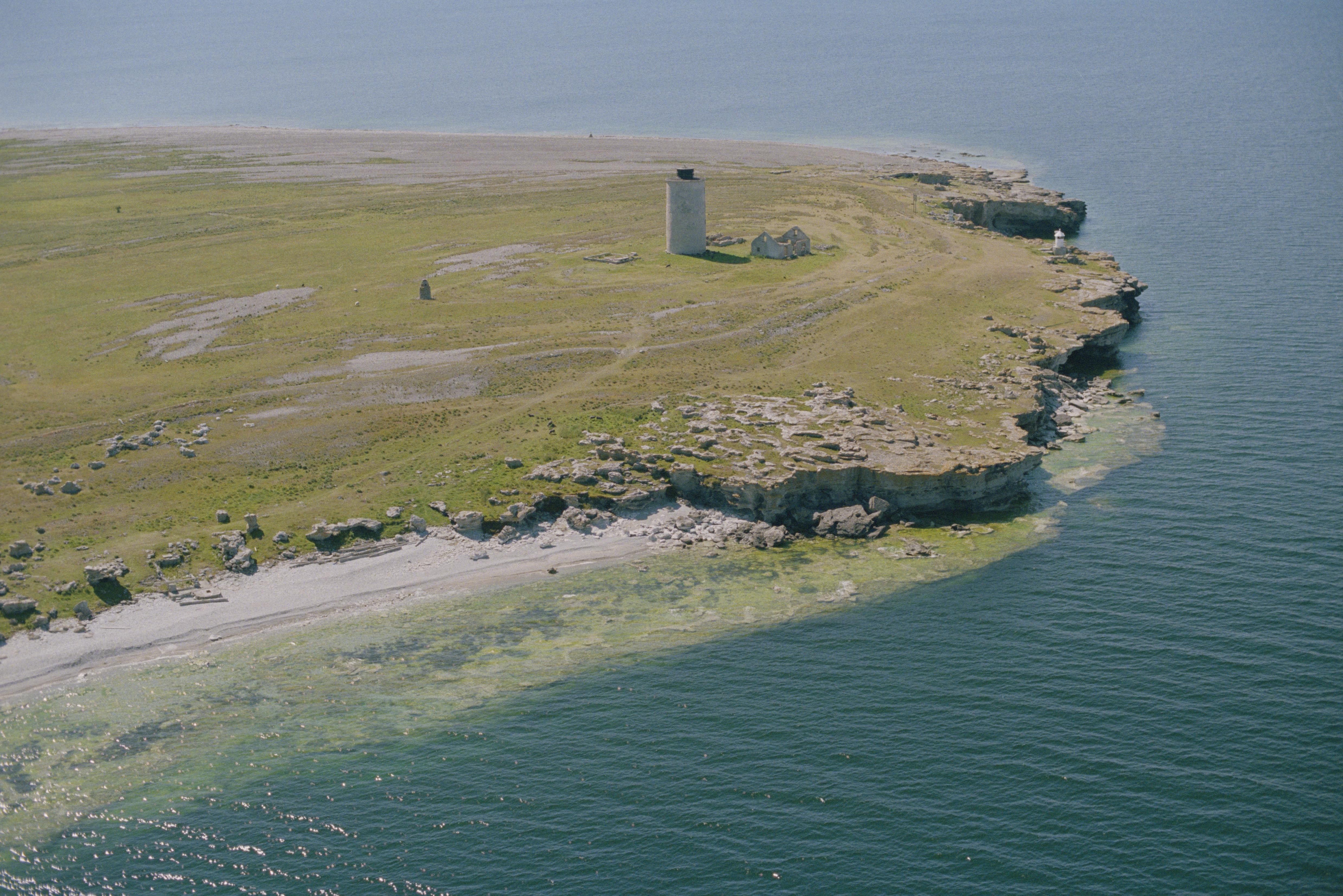 Beskrivning: Ön Östergarnsholm har fyra fyrar. I bilden Östergarns gamla fyr med provisoriska stenkolsfyren. Dessa två är byggda på 1800-talet och är byggnadsminnen. De andra två (ej i bilden) är byggda på 1900-talet. Gamla fyrplatsen RAÄnr Östergarn 103:1 är byggd i fornborg RAÄnr Östergarn 20:1. Bilden är tagen mot (väderstreck): S