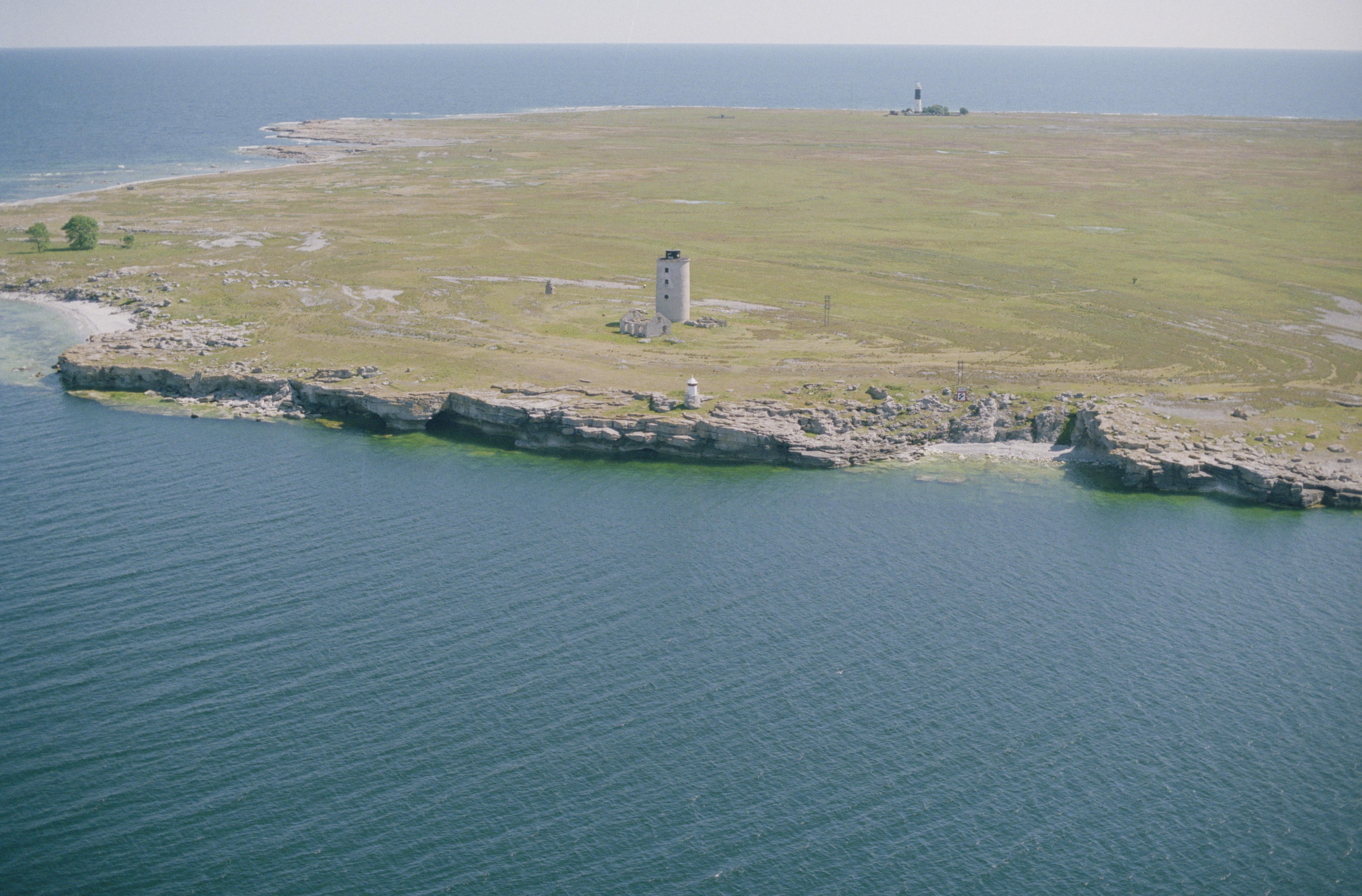 Beskrivning: Ön Östergarnsholm har fyra fyrar (alla syns i bilden). Vid bildens mitt Östergarns gamla fyr med provisoriska stenkolsfyren, båda från 1800-talet. Dessa två är byggnadsminnen. De andra två (en i bildens mitt och en i övre delen) är byggda på 1900-talet. Gamla fyrplatsen RAÄnr Östergarn 103:1 är byggd i fornborg RAÄnr Östergarn 20:1. Bilden är tagen mot (väderstreck): NO