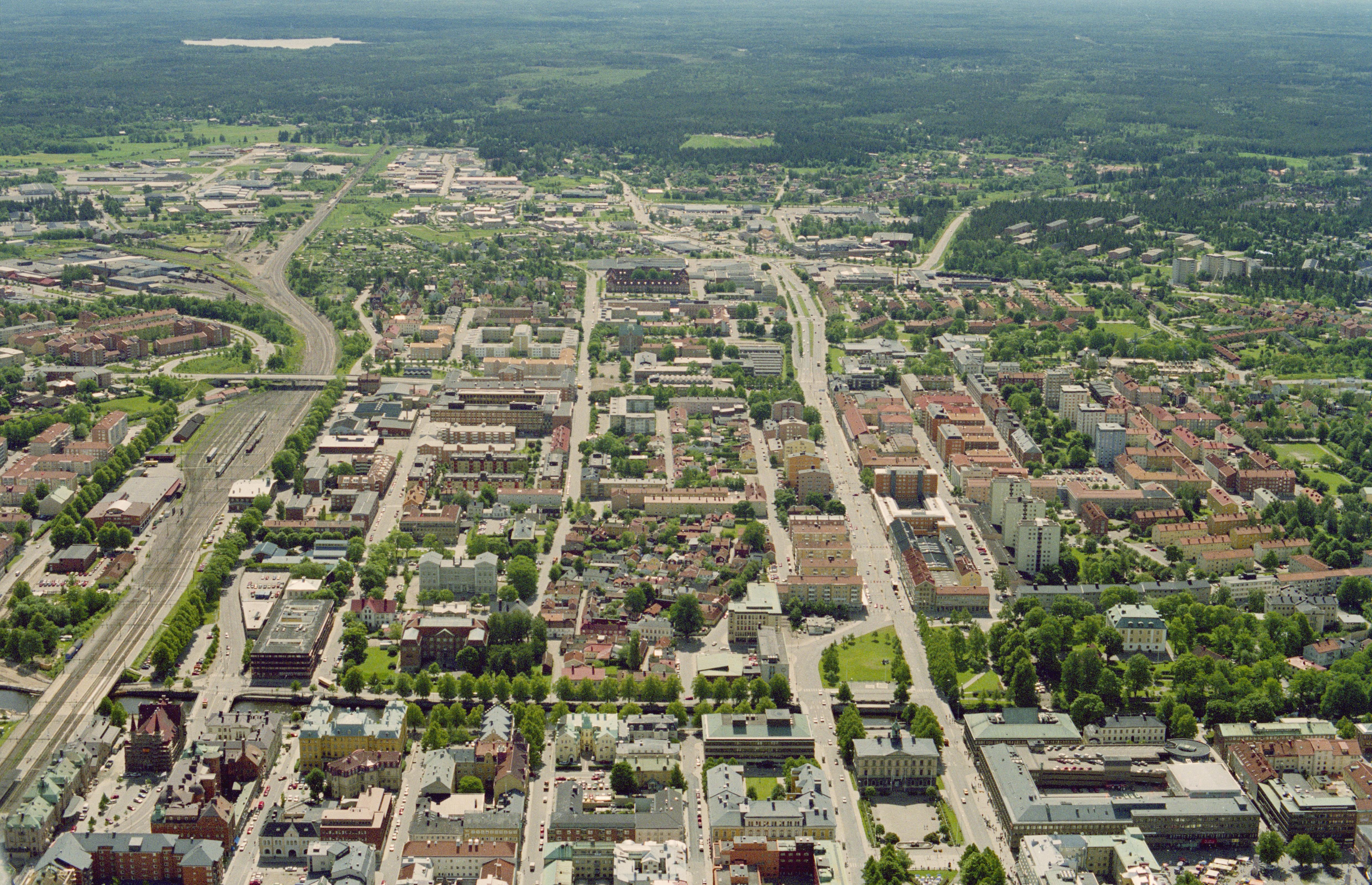Beskrivning: Gävle tätort. Stadslager RAÄnr Gävle 51:1. Stadshuset och Rådhustorget vid Gavleån under bildens mitt. Byggnadsminnet Gävle slott nere i bildens högra hörn. Bilden är tagen mot (väderstreck): SSO