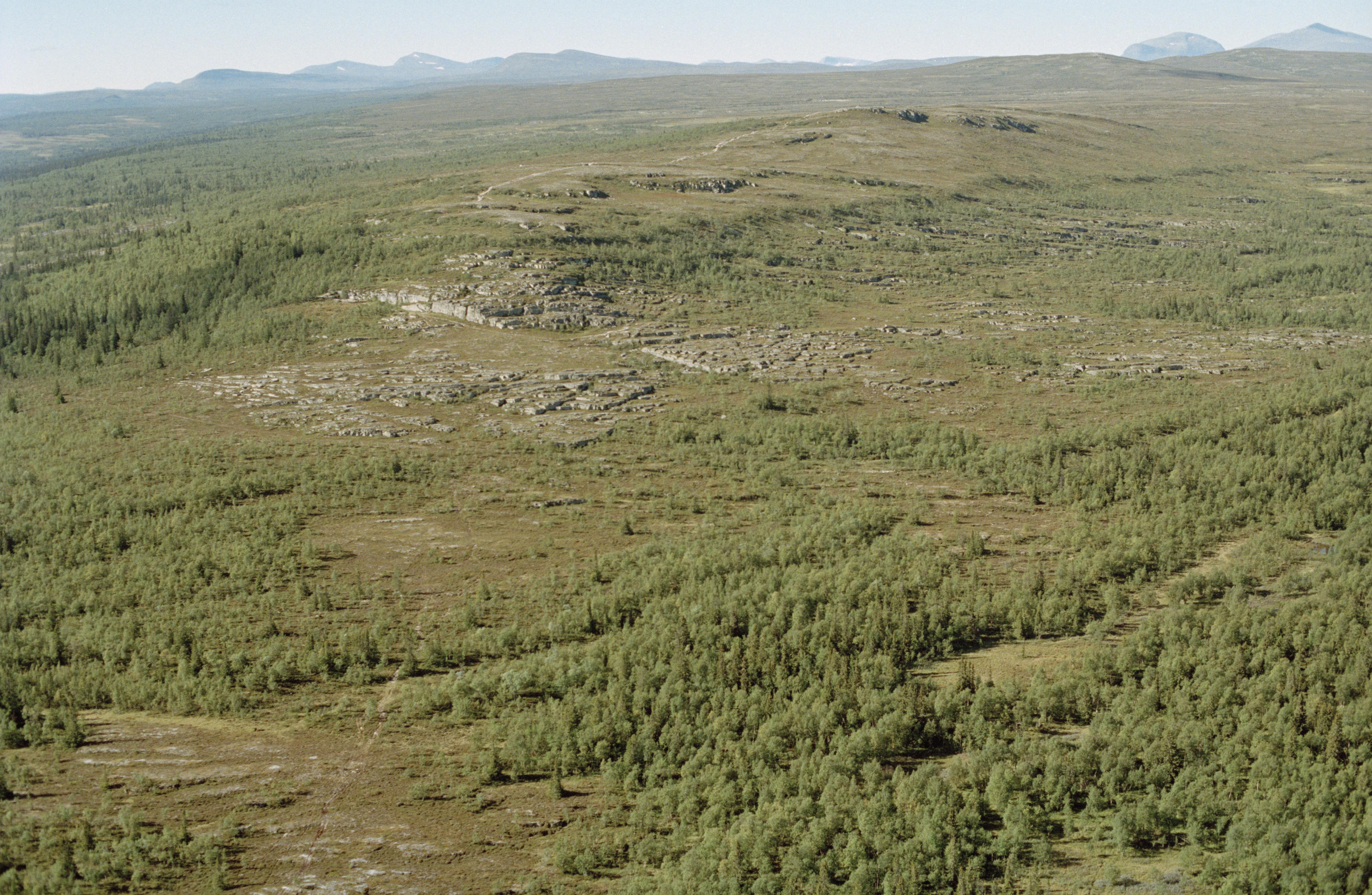 Beskrivning: Östra delen av lågfjället Flatruet (Fleete) vid bergstoppen Ruändan (Sjnjaptjegietije). I bergsidan till vänster över bildens mitt en lodrätt klippvägg med hällmålningar RAÄnr Tännäs 58:1. Bilden är tagen mot (väderstreck): V