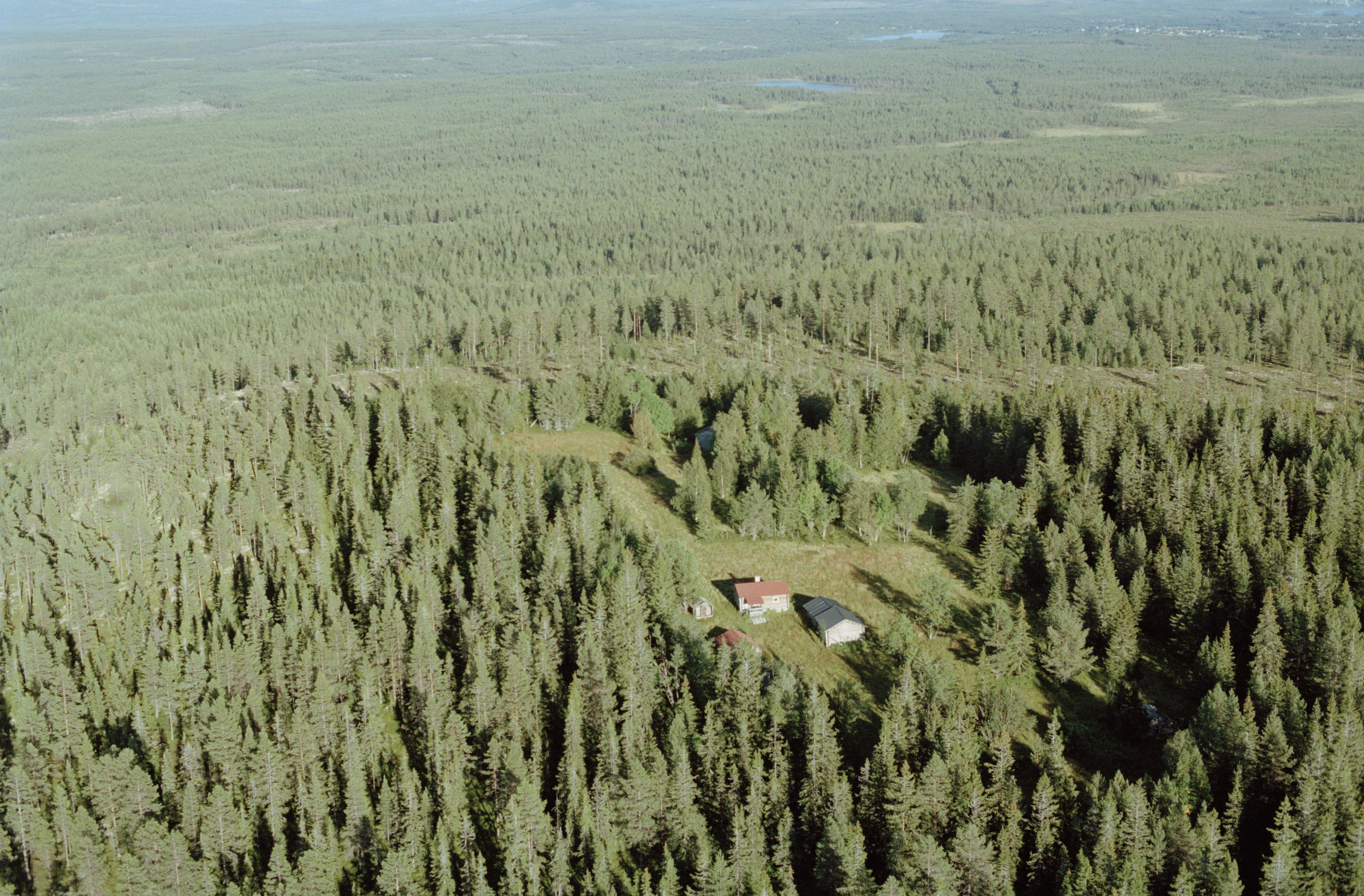 Beskrivning: Fäboden Bergsvallen. I skogen i bildens övre del blästblats RAÄnr Lillhärdal 129:1. Uppe till höger skymtas Kyrkbyn i Lillhärdal. Bilden är tagen mot (väderstreck): OSO