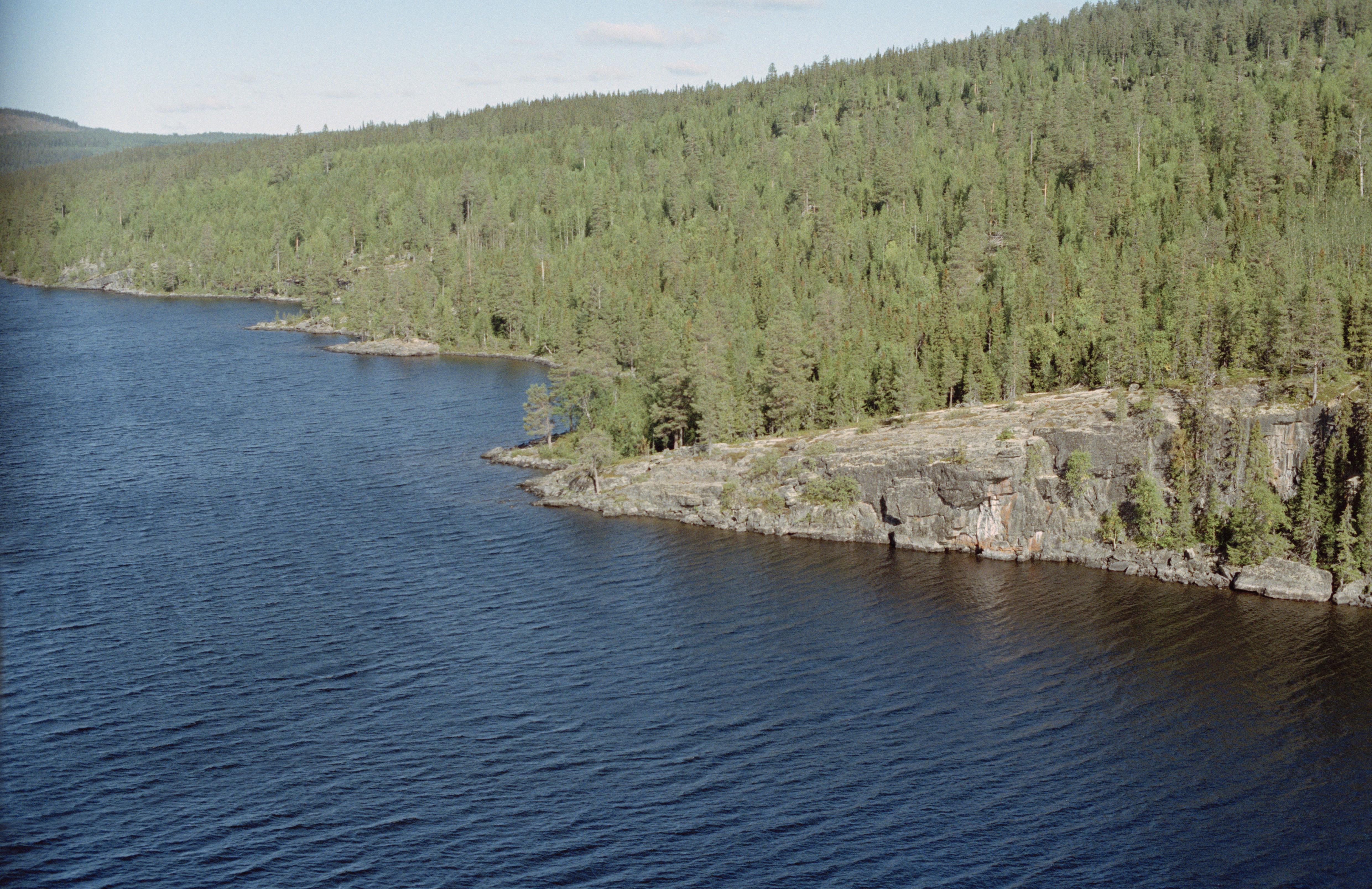 Beskrivning: Skärvångssjön norrväst om Norra Skärvångens by. Vid bildens mitt Brattberget med hällmålning RAÄnr Föllinge 346:1. Över bildens mitt hällmålning RAÄnr Föllinge 346:1 vid Hällberget och boplats Föllinge 175:1. Bilden är tagen mot (väderstreck): N