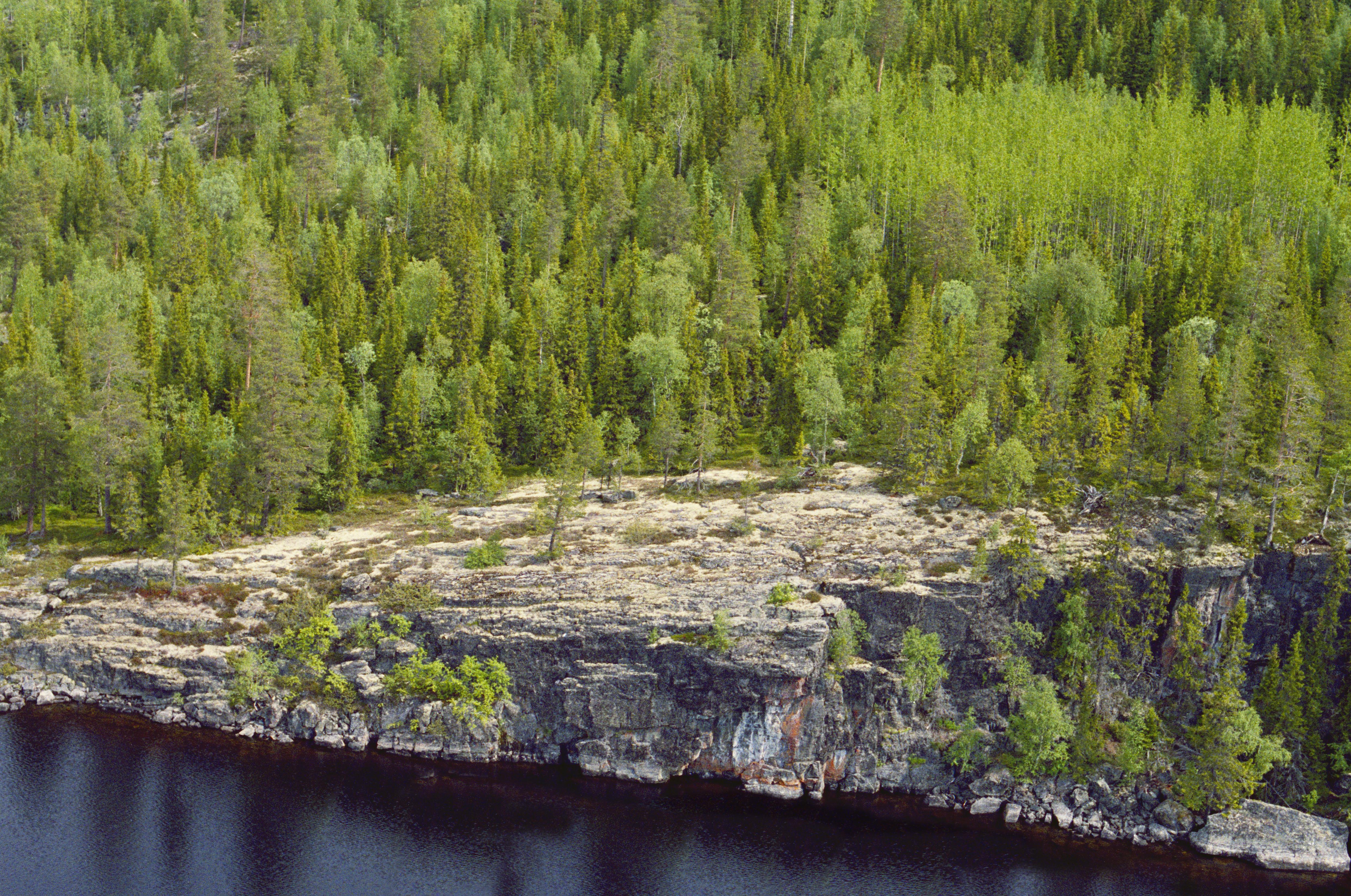 Beskrivning: Skärvångssjön norrväst om byn Norra Skärvången. Vid bildens mitt hällmålning RAÄnr Föllinge 346:1 vid Brattberget under Norsjöberget. Uppe till vänster boplats RAÄnr Föllinge 175:1. Bilden är tagen mot (väderstreck): NNO