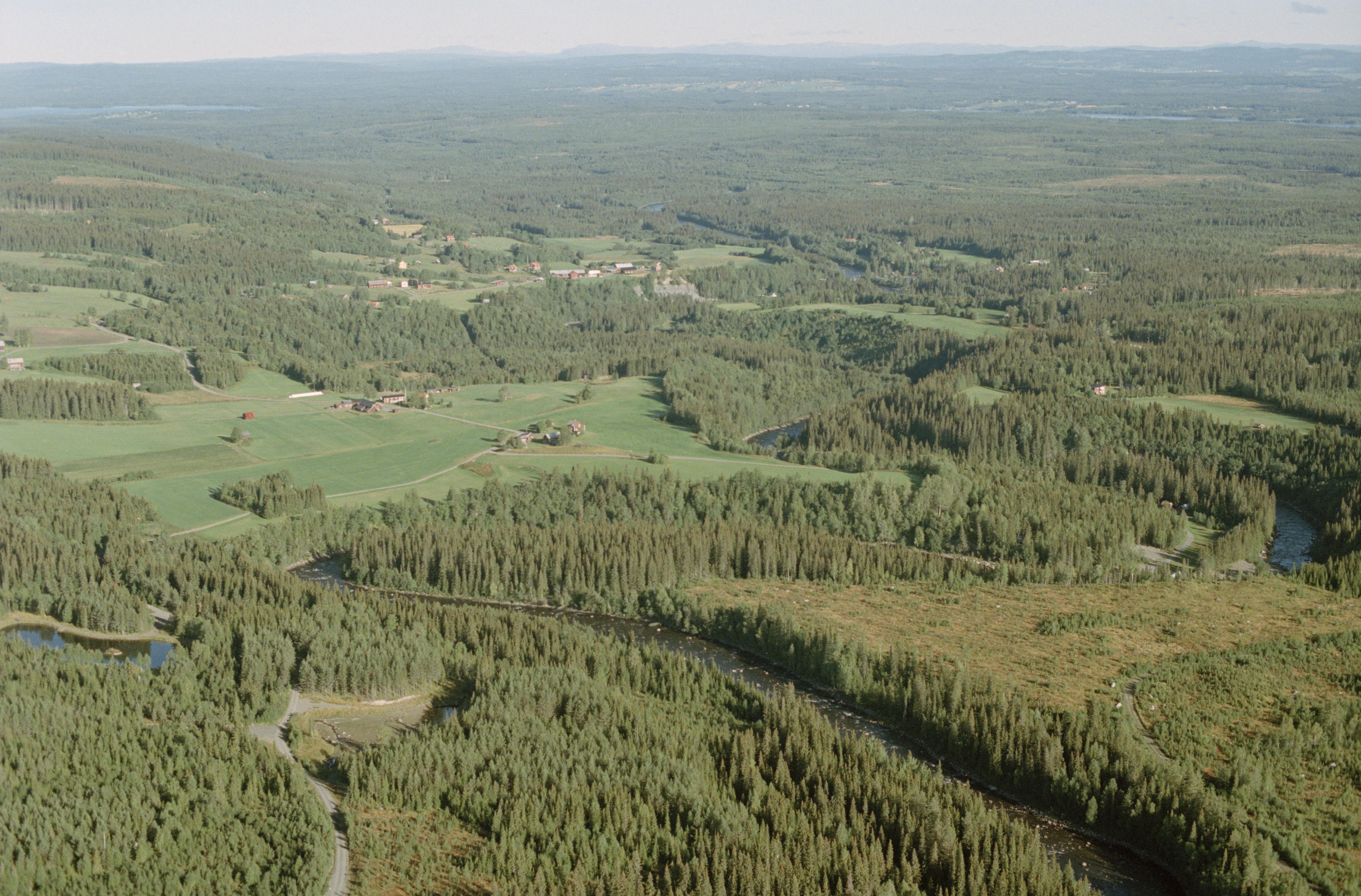 Beskrivning: Dammåns dalgång. Vid bildens mitt byn Hallbrännan. Över bildens mitt byarna Ån, Ågårdarna och Böle. Under bildens mitt lämningar efter flottningsanläggning RAÄnr Hallen 332 och 336. Bilden är tagen mot (väderstreck): N