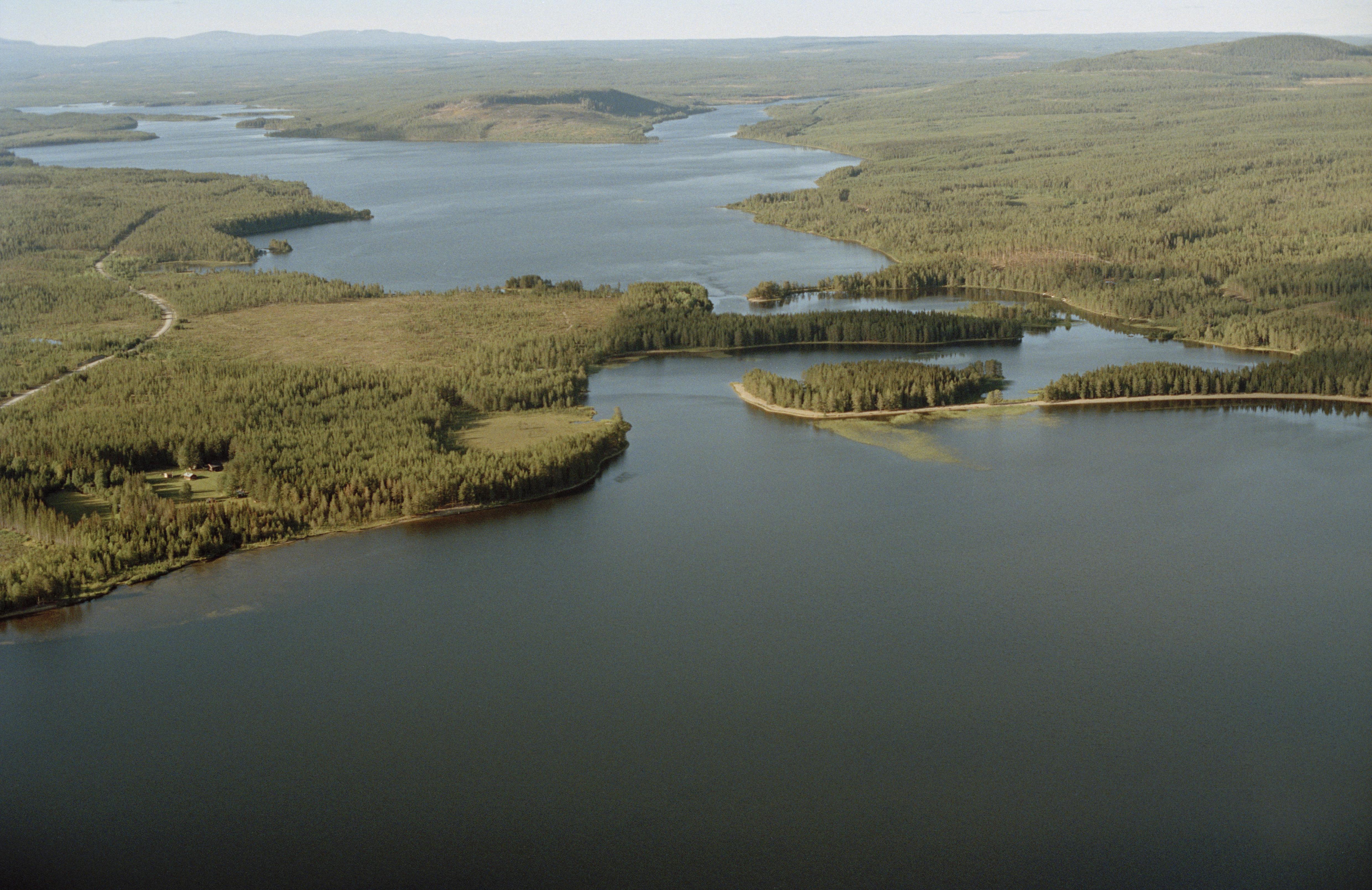 Beskrivning: Vid bildens mitt Klövsjösundet mellan Klövsjön (i bildens nedre del) och Lännässjön (i bildens övre del). På udden Östhövdet till höger om bildens mitt fångstgropar och boplats RAÄnr Klövsjö 2:1 m.m. Bilden är tagen mot (väderstreck): NNV
