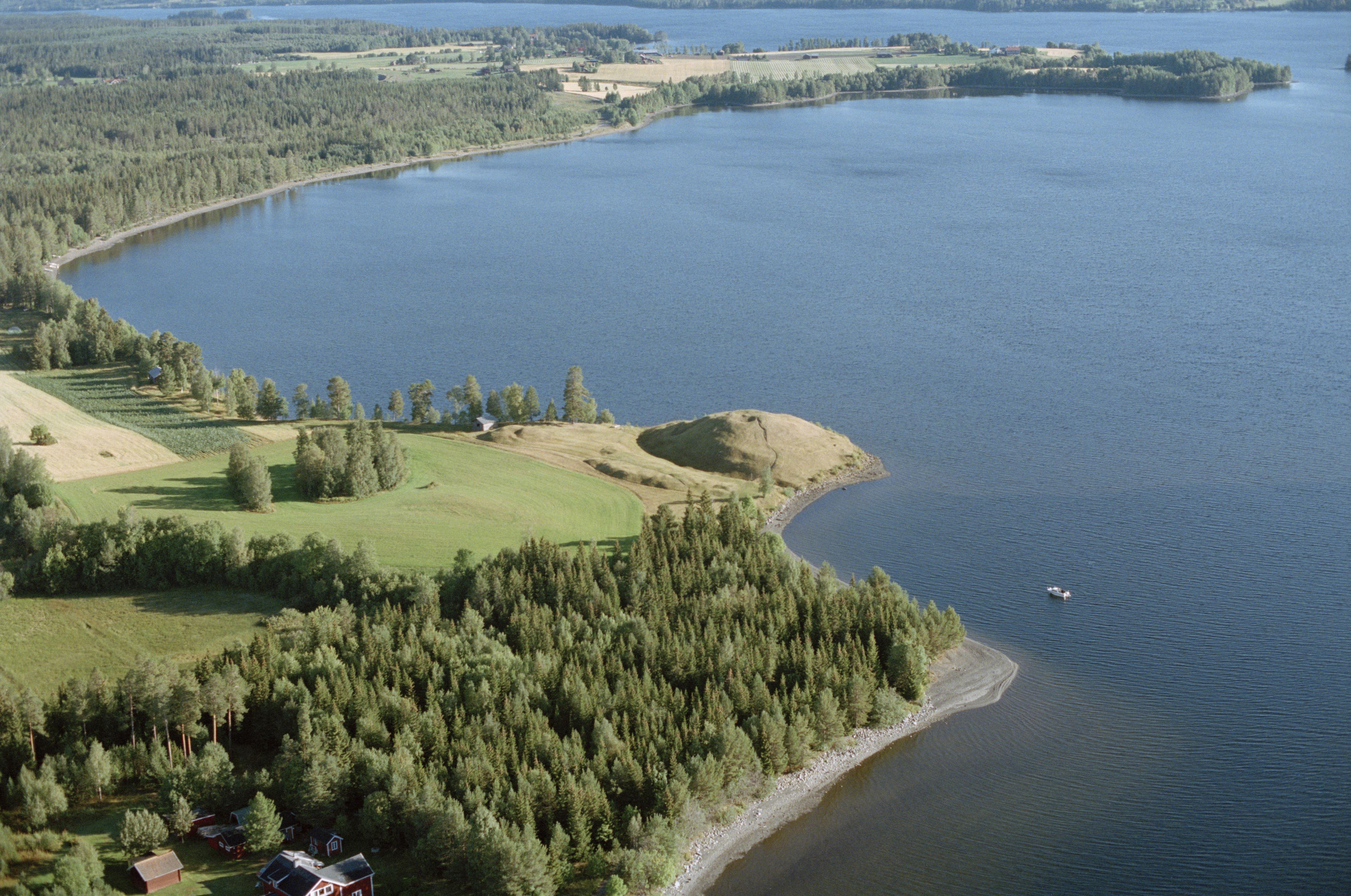 Beskrivning: Tibrandshögen RAÄnr Rödön 17:1, resterna av den medeltida borgen Tibrandsholm på näset mellan Storsjön och Åssjön. I området stensättningar och fossil åker RAÄnr Rödön 18:1-3. Bilden är tagen mot (väderstreck): NO