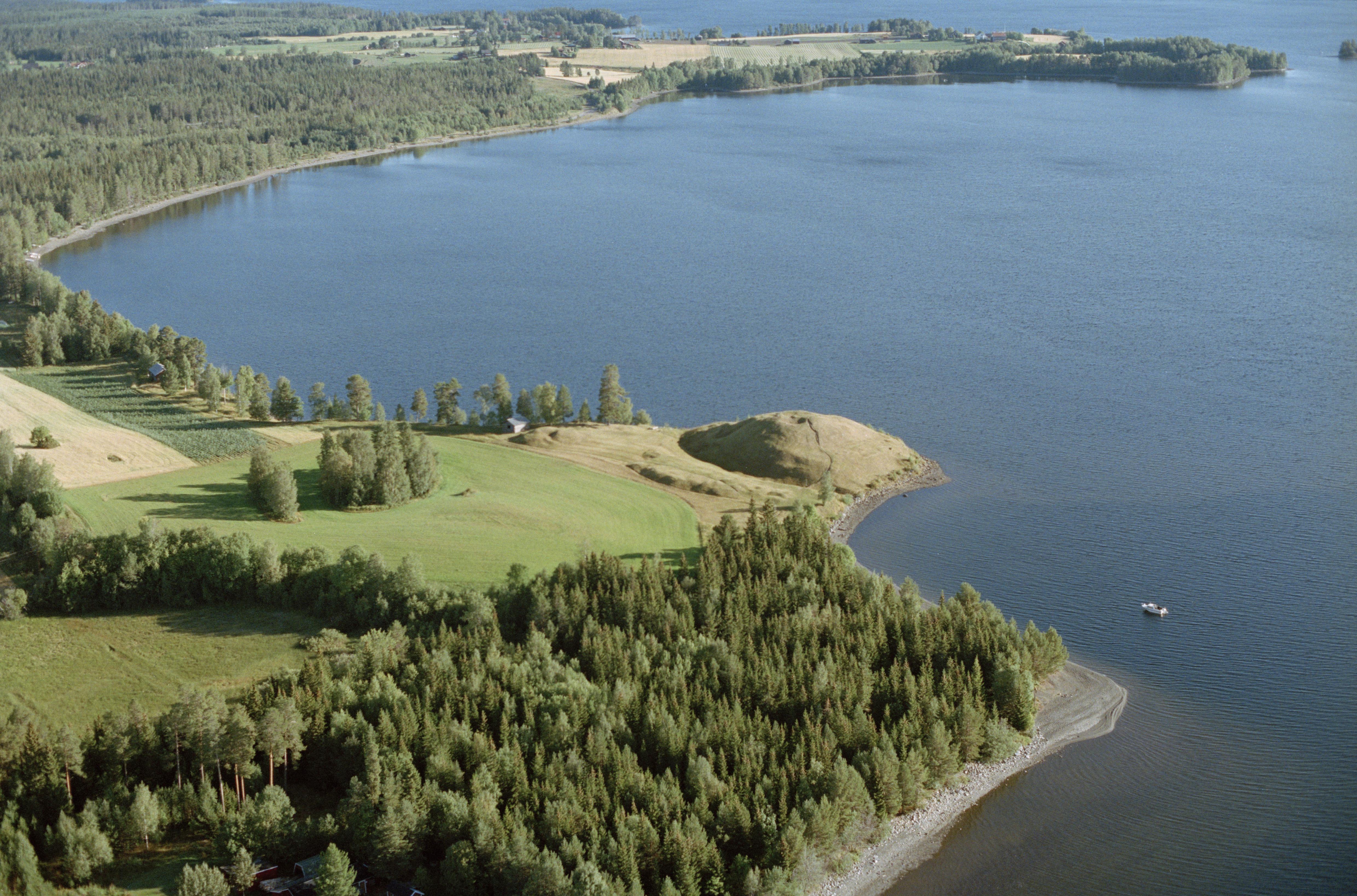 Beskrivning: Tibrandshögen RAÄnr Rödön 17:1, resterna av den medeltida borgen Tibrandsholm på näset mellan Storsjön och Åssjön. I området stensättningar och fossil åker RAÄnr Rödön 18:1-3. Bilden är tagen mot (väderstreck): NO