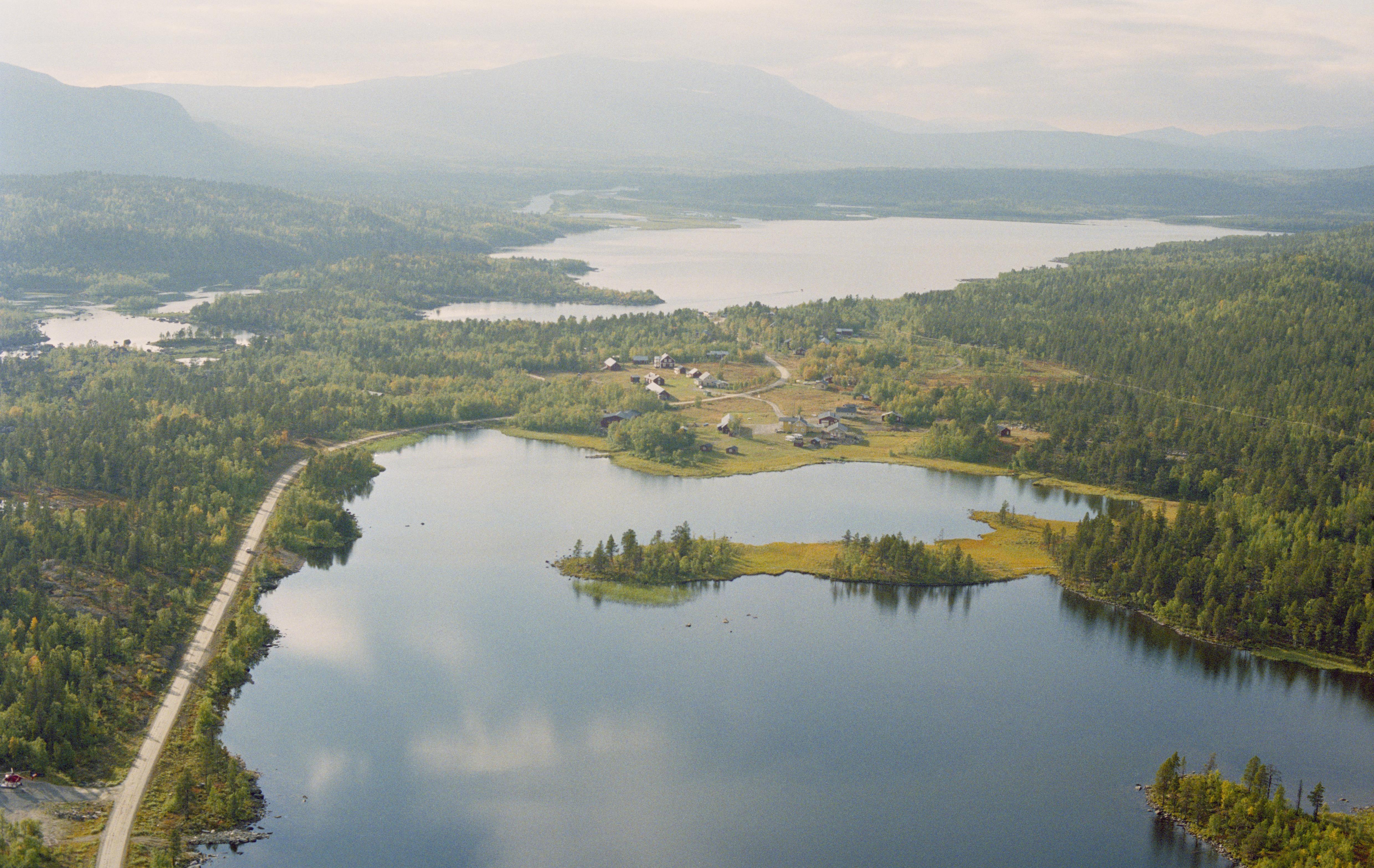 Beskrivning: Vid bildens mitt Adolfsström (skrivs även Adolfström) by och f.d. bruk mellan sjöarna Lárvvejávrre och Mittisjön (Gasskajávrre)vid Laisälven (Lájsso). I byn hyttområde RAÄnr Arjeplog 566:1 m.m. Bilden är tagen mot (väderstreck): V