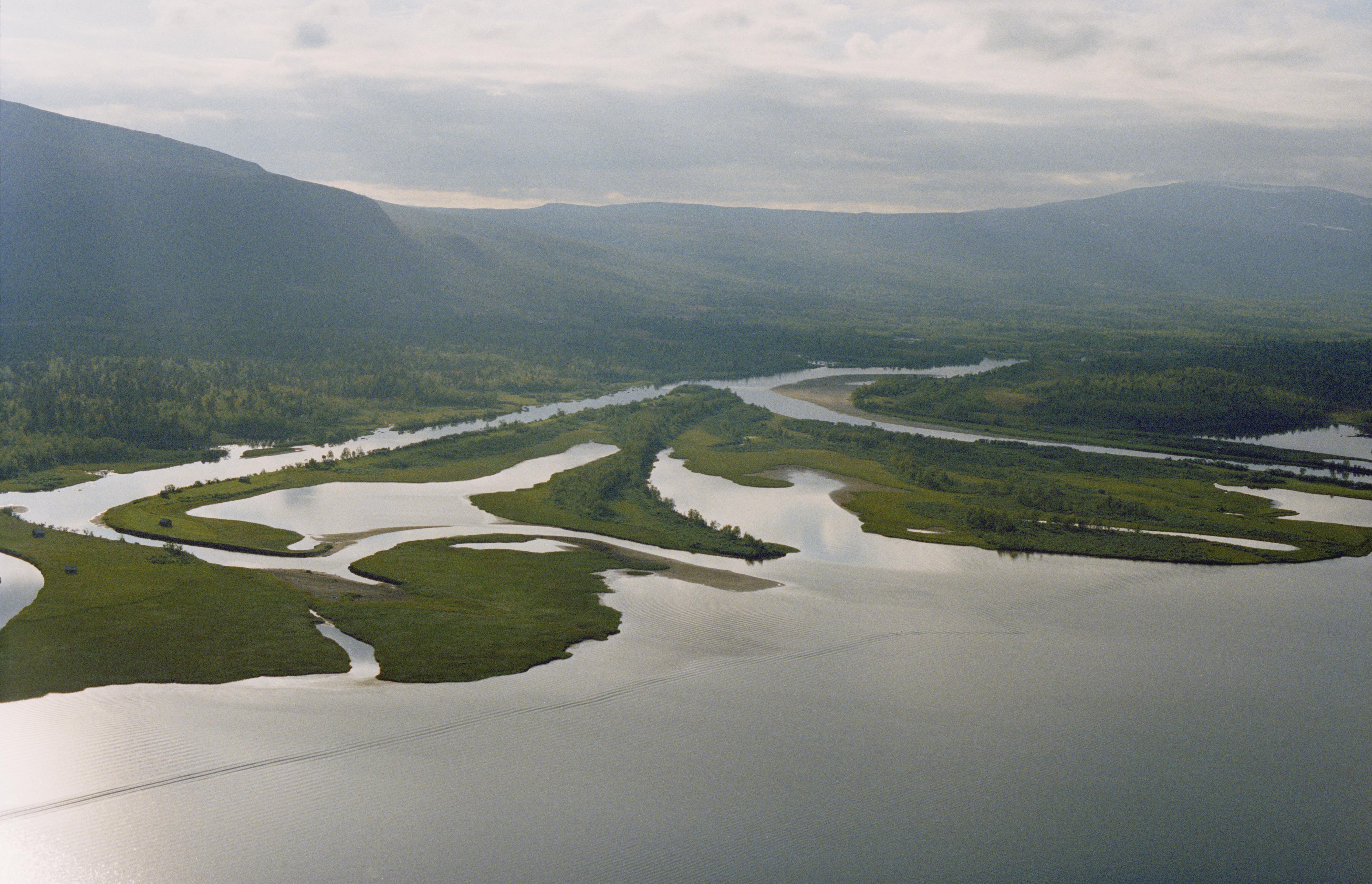 Beskrivning: Till höger över bildens mitt byn Bäverholmen (Vaddnemsuolo). I bildens nedre del området Yrafdeltat (skrivs även Irafdeltat) där Laisälven (Lájsso) rinner in i sjön Iraft (Yraft). Till höger om bildens mitt härd RAÄnr Arjeplog 564:1. Bilden är tagen mot (väderstreck): SV
