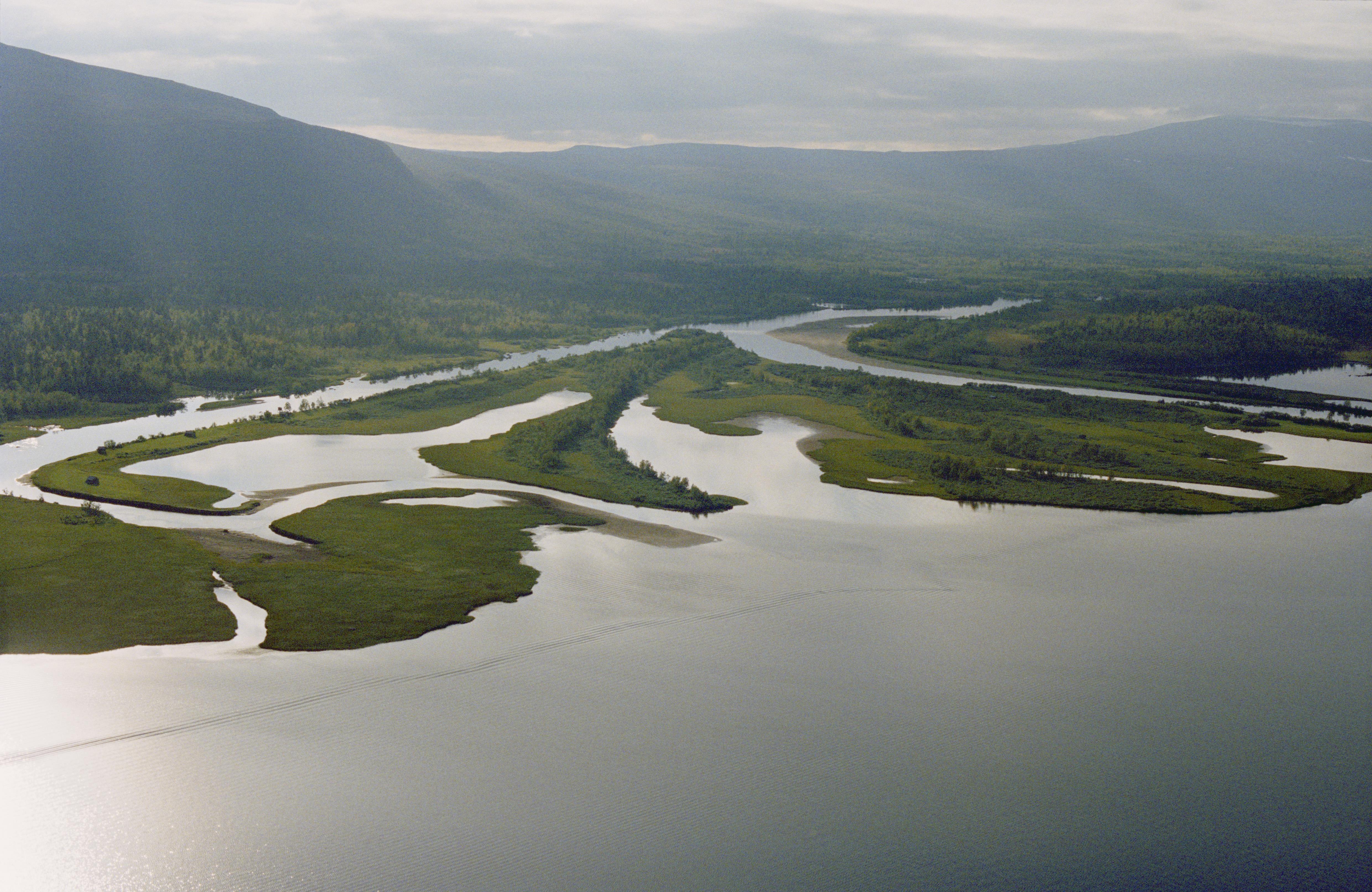 Beskrivning: Till höger över bildens mitt byn Bäverholmen (Vaddnemsuolo). I bildens nedre del området Yrafdeltat (skrivs även Irafdeltat) där Laisälven (Lájsso) rinner in i sjön Iraft (Yraft). Till höger om bildens mitt härd RAÄnr Arjeplog 564:1. Bilden är tagen mot (väderstreck): SV