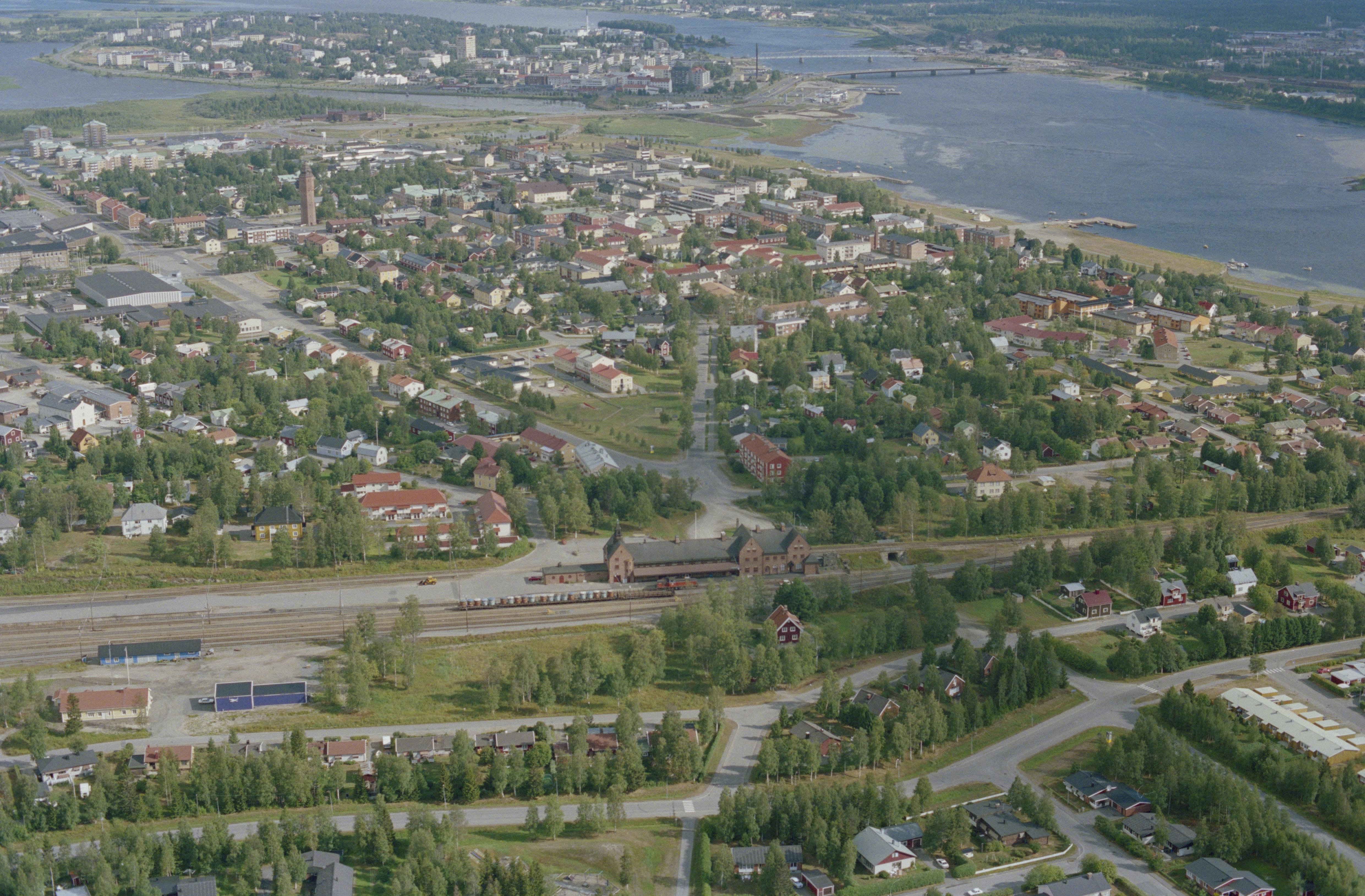 Beskrivning: Haparanda (Haaparanta) stad / tätort (i f.d. Haparanda socken) vid Torneälvens mynning i Bottenviken och riksgränsen mot Finland i öst. Haparanda järnvägsstation i bildens nedre del. Till vänster över bildens mitt Torget med minnesmärke RAÄnr Nedertorneå 156:1. Bilden är tagen mot (väderstreck): NNO
