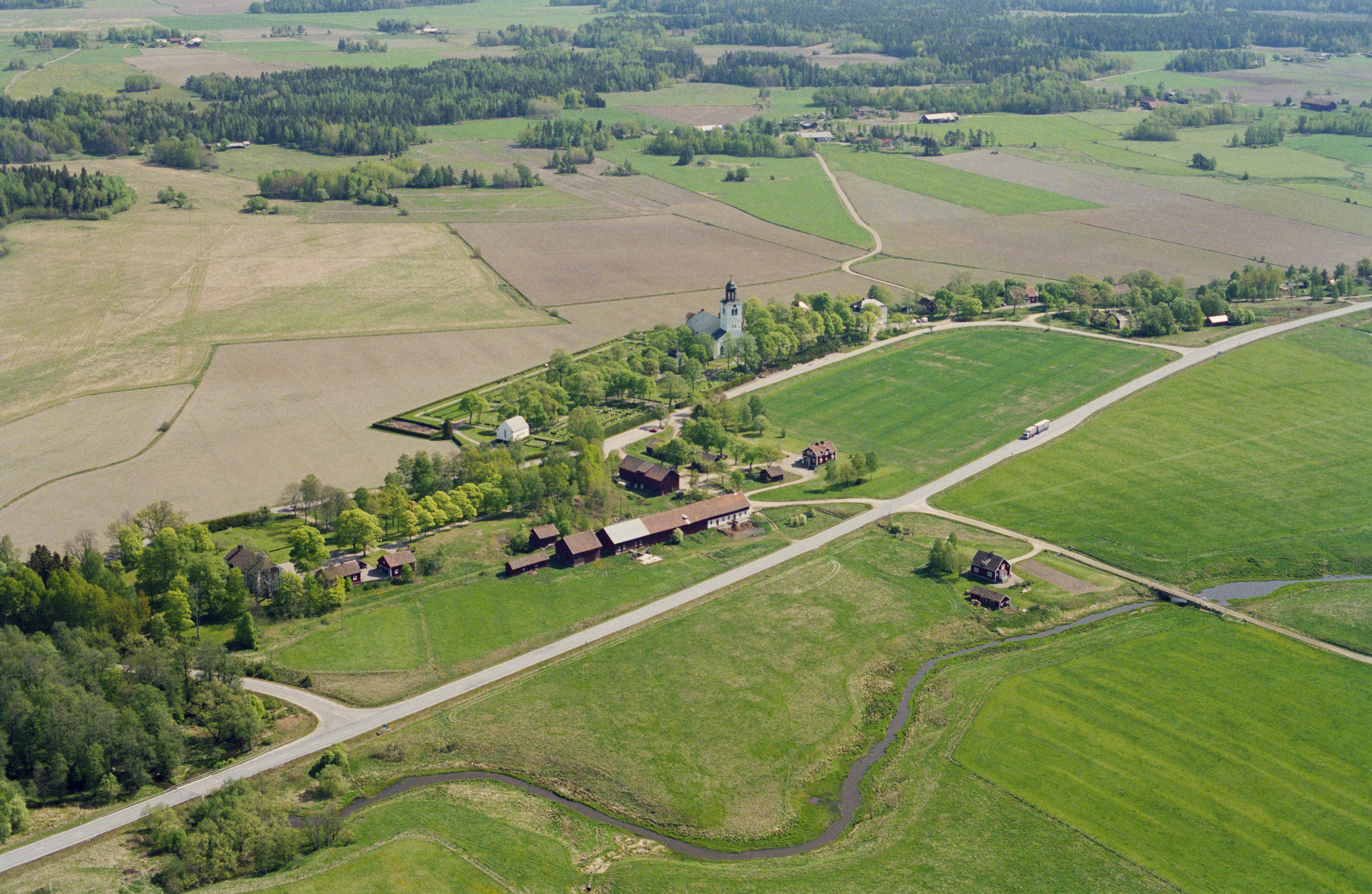 Beskrivning: Vid bildens mitt Fellingsbro kyrka och kyrkby i Ässingåns dalgång. På sydost sidan av kyrkan kastalruinen RAÄnr Fellingsbro 231:1. Bilden är tagen mot (väderstreck): Ö