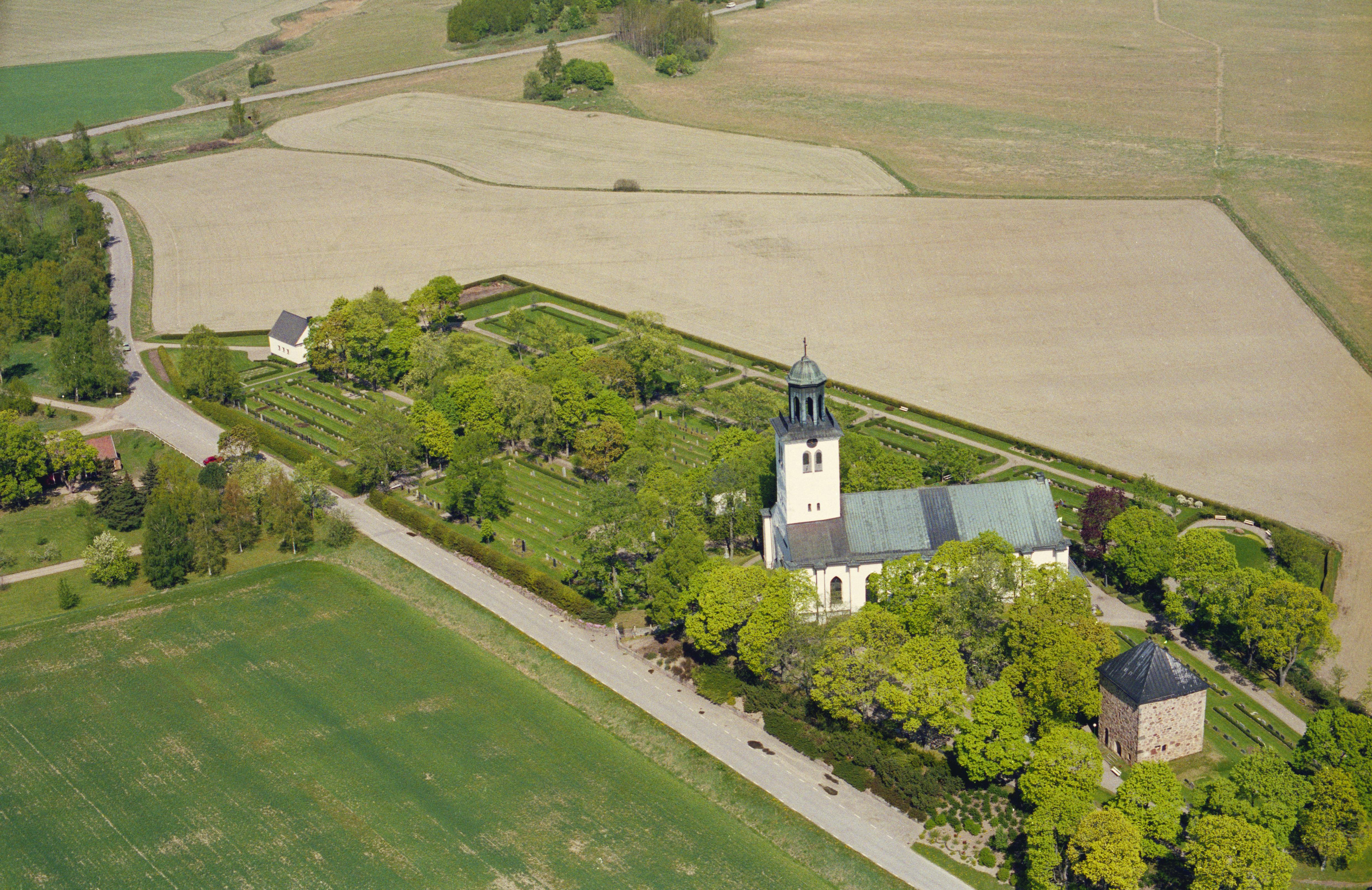 Beskrivning: Fellingsbro kyrka och kyrkby i Ässingåns dalgång. Nere till höger kastalruinen RAÄnr Fellingsbro 231:1. Bilden är tagen mot (väderstreck): NNV