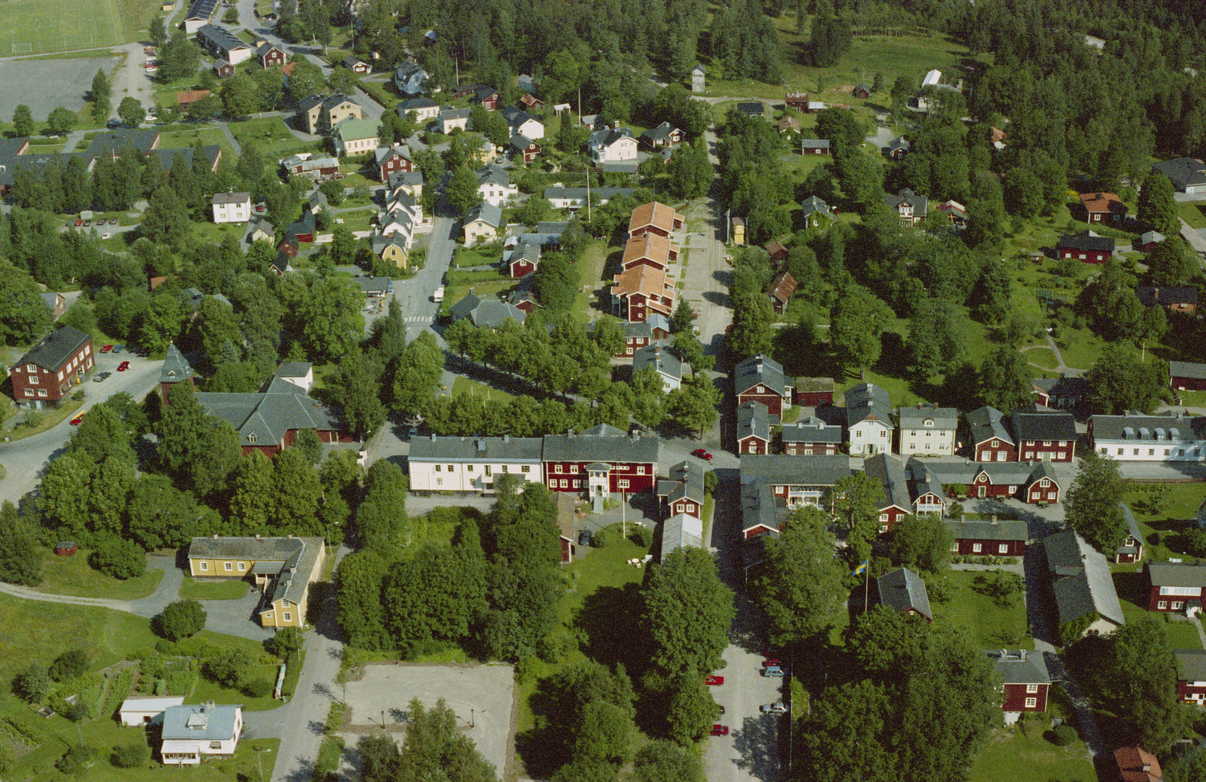 Beskrivning: Tätorten Grythyttan. Till vänster under bildens mitt Grythyttans kyrka RAÄnr Grythyttan 88:1. Bilden är tagen mot (väderstreck): N