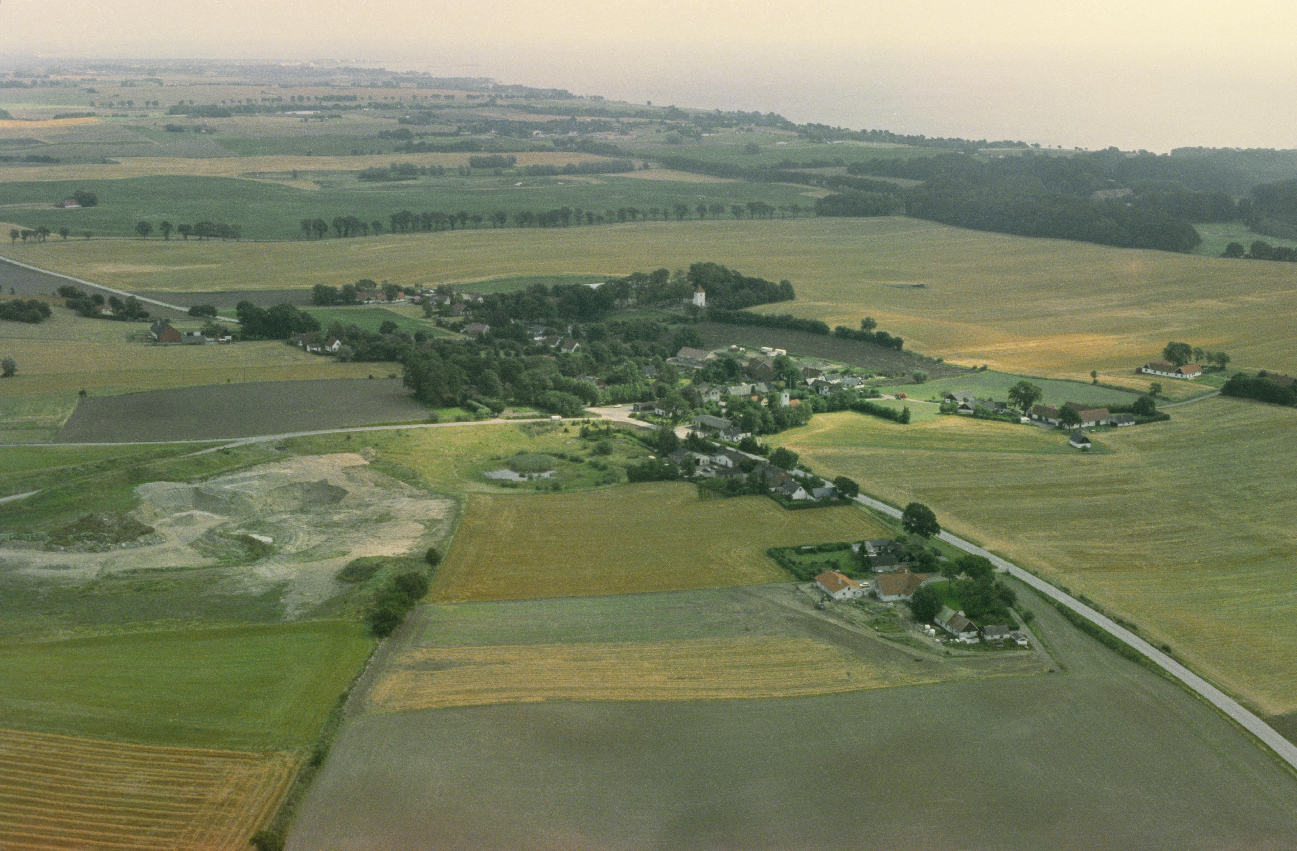 Beskrivning: Snårestads kyrka och kyrkby. Bilden är tagen mot (väderstreck): SO
