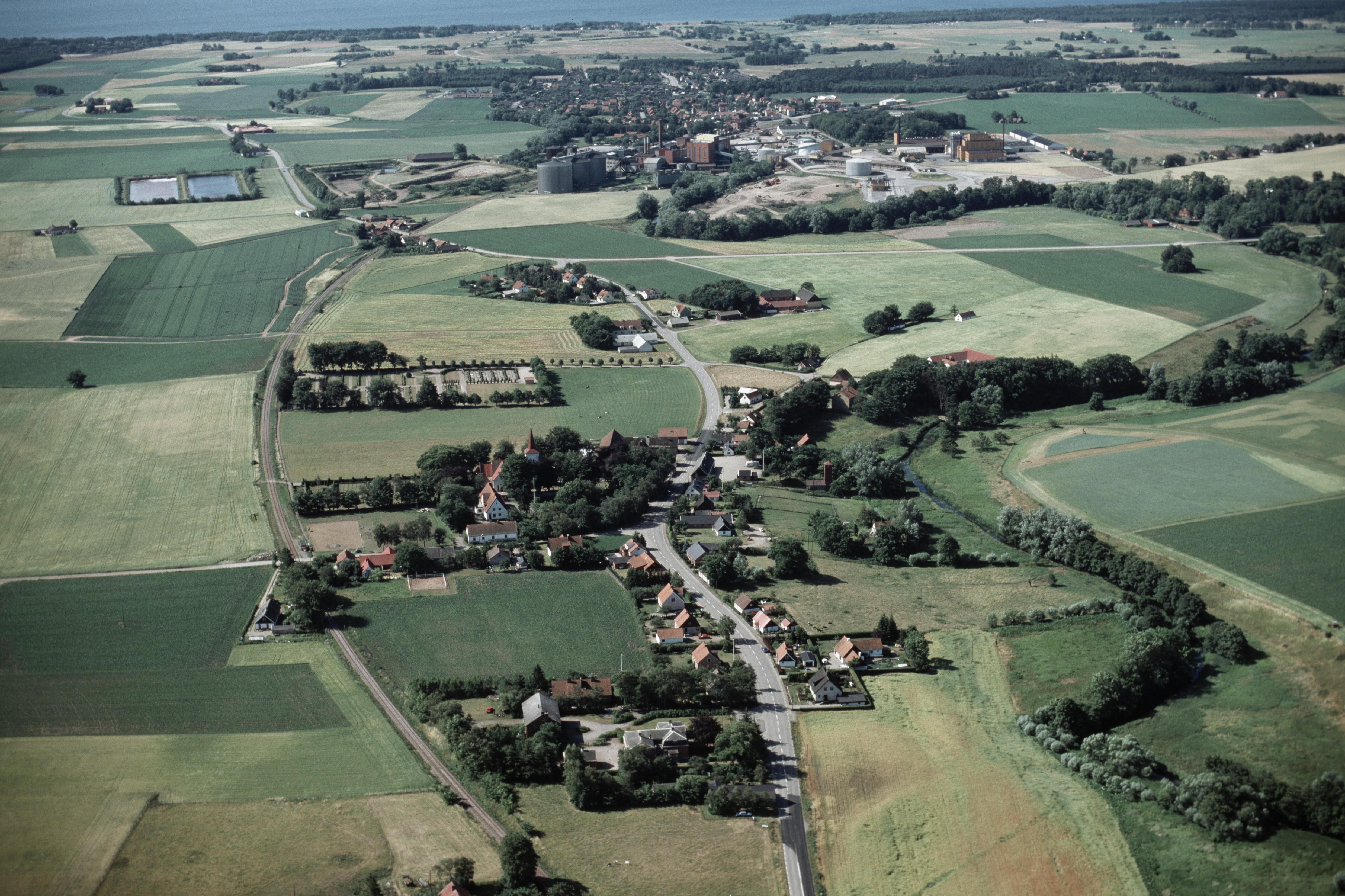 Beskrivning: Nybroån. Stora Köpinge kyrka till vänster om bildens mitt. I bildens övre del Köpingebro. Bilden är tagen mot (väderstreck): SSV