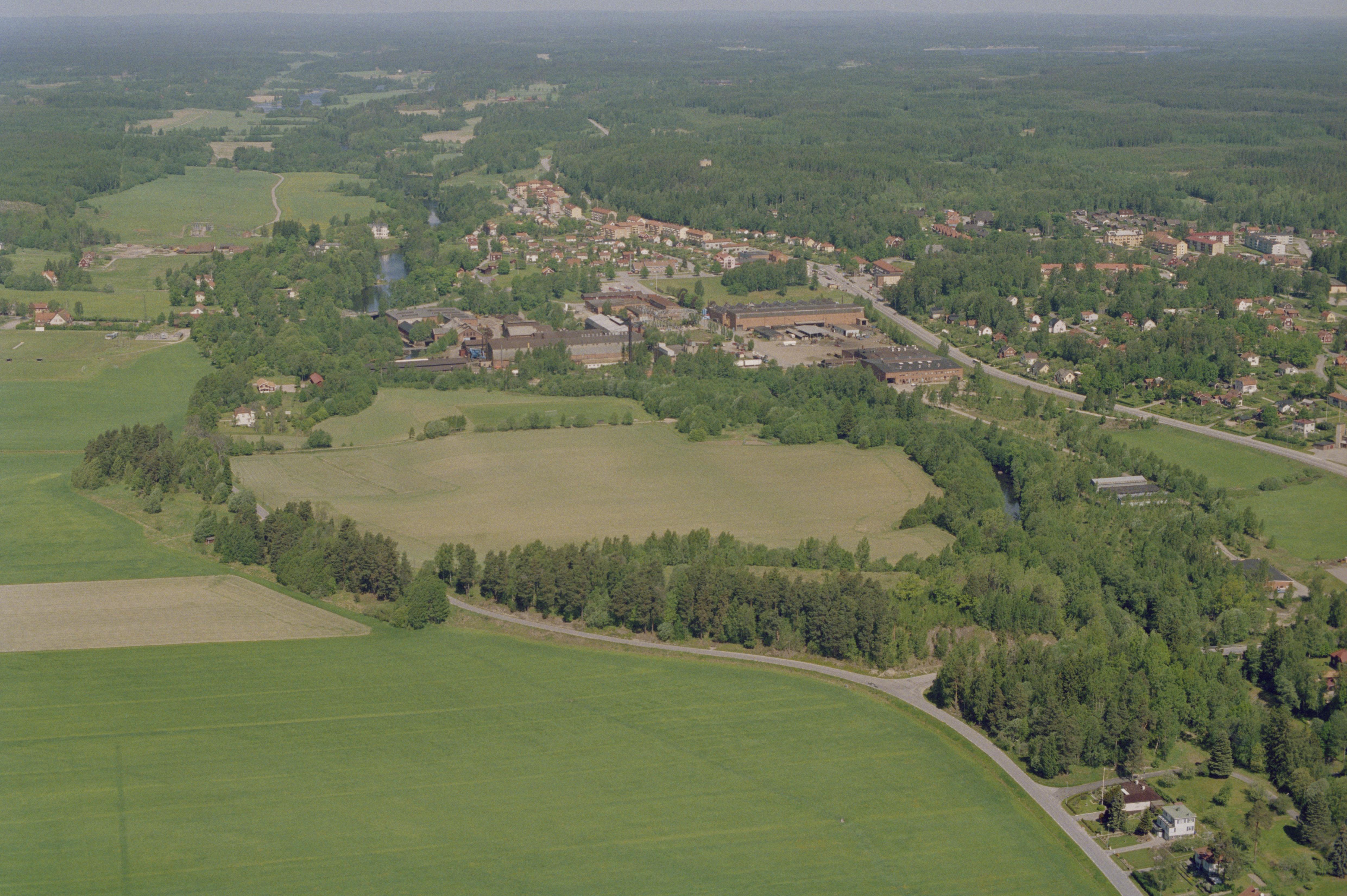 Beskrivning: Hedströmmen vid Kolsva bruk och tätort. Till vänster över bildens mitt Kolsva herrgård (skrivs även Kohlswa herrgård) och till höger Kolsva brukskyrka. I skogen uppe till höger fornborg RAÄnr Kolsva 63:1. Bilden är tagen mot (väderstreck): N