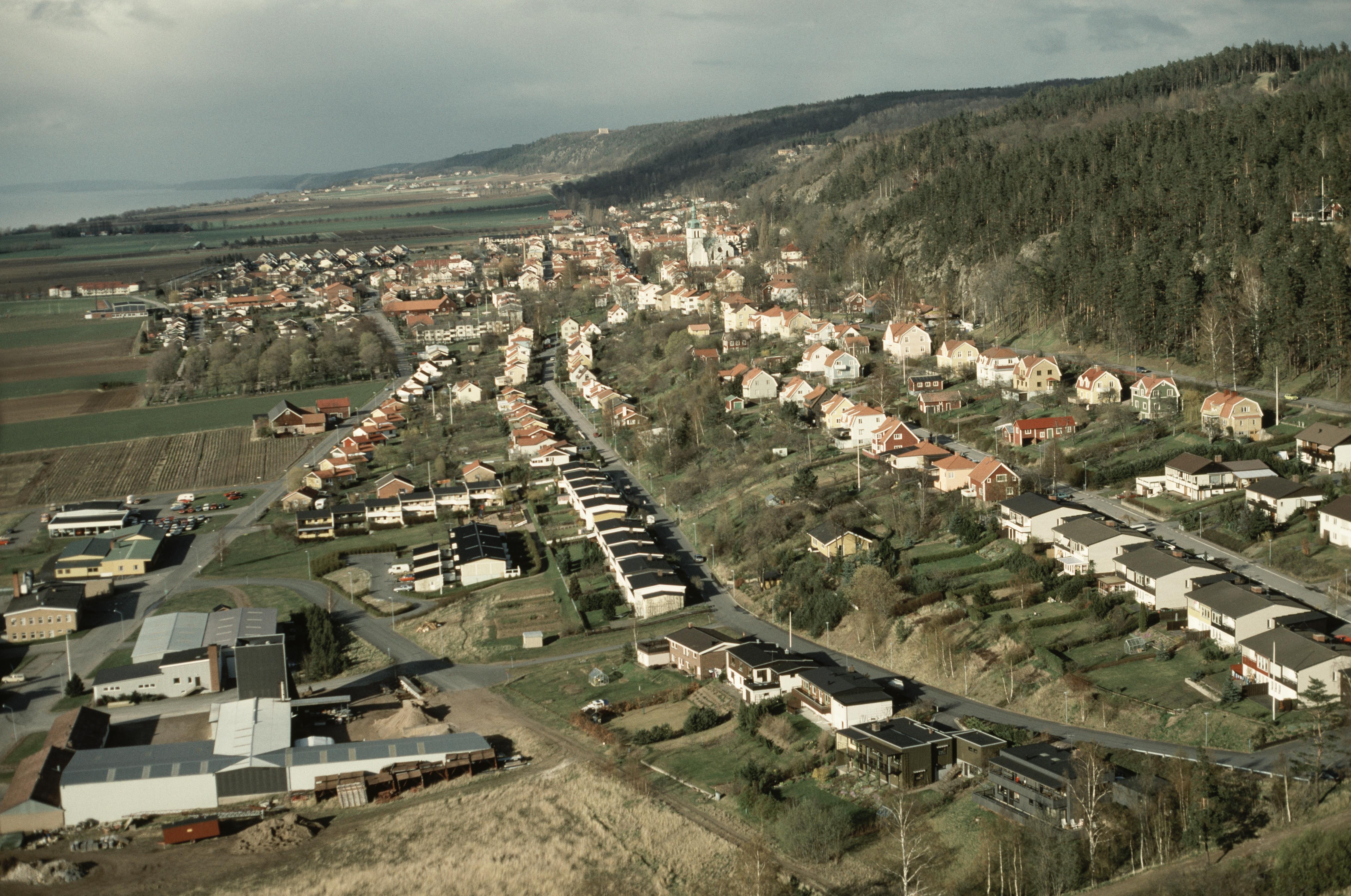 Beskrivning: Gränna kyrka och tätort. I bildens övre del slottsruin Brahehus RAÄnr Gränna 43:1. Bilden är tagen mot (väderstreck): NO