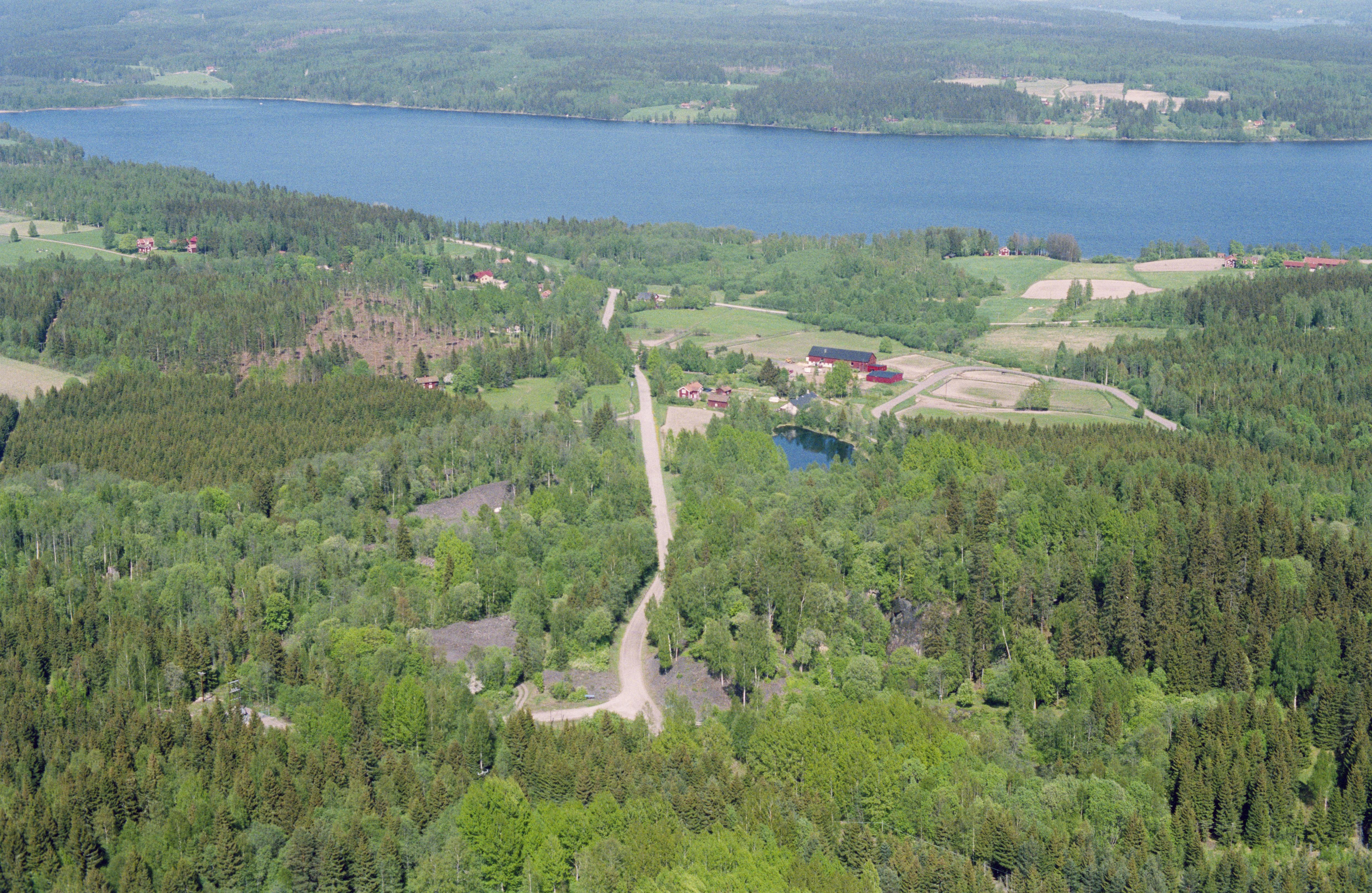 Beskrivning: Gruvparken mellan byarna Klacka-Lerberg i Nora socken (i bildens nedre kant) och Kåfallstorp i Järnboås socken. Under bildens mitt gruvområde RAÄnr Järnboås 85:1 m.fl. Till vänster om vägen transportbana för malm RAÄnr Järnboås 55:1. Över bildens mitt Kåfallstorps by vid Fåsjön. Bilden är tagen mot (väderstreck): NO