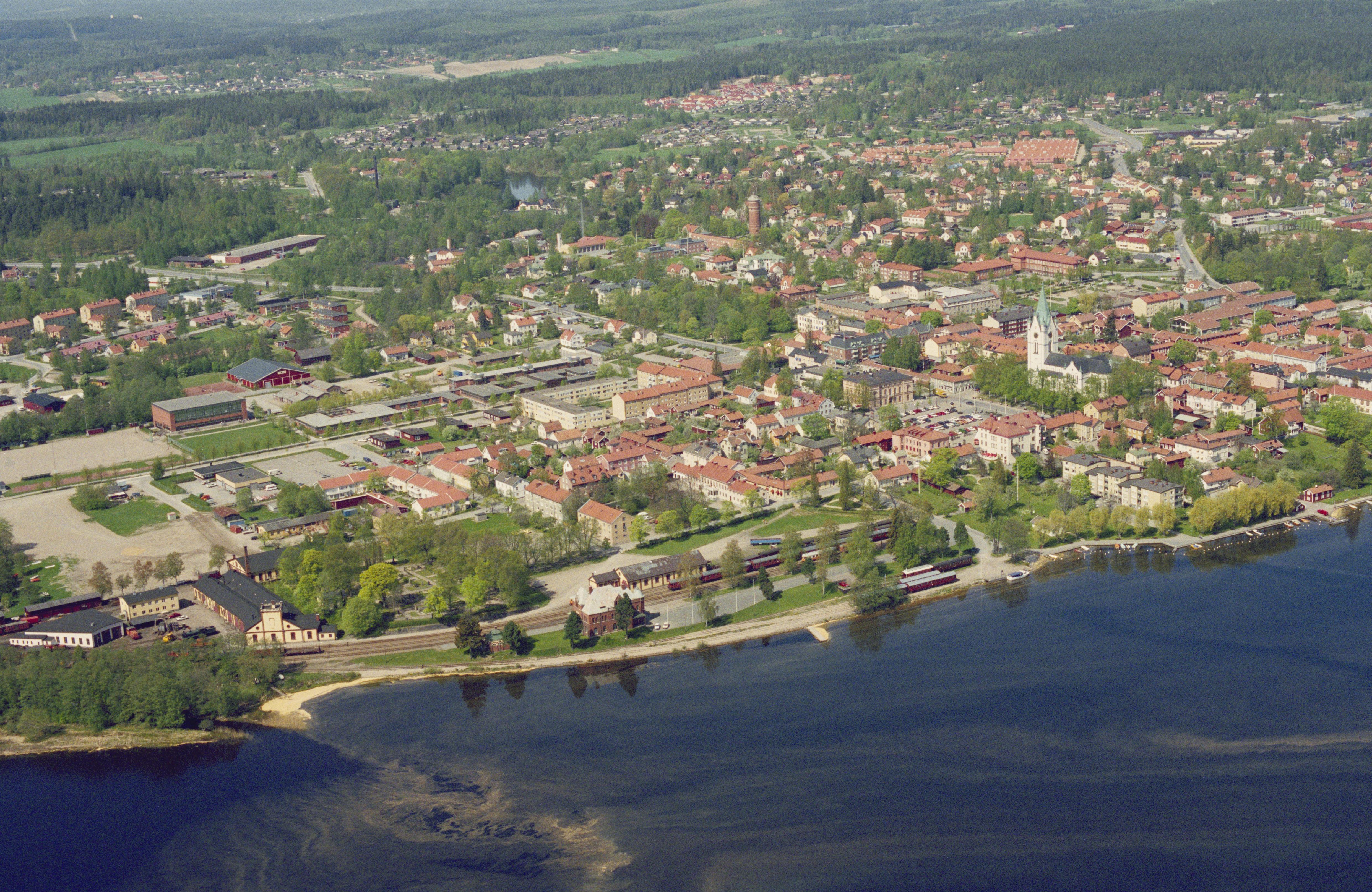 Beskrivning: Nora stad vid Hagbyån och Norasjön. Nora kyrka till höger över bildens mitt. Stadslager RAÄnr Nora 164:1 i området vid kyrkan och Torget. Bilden är tagen mot (väderstreck): NV