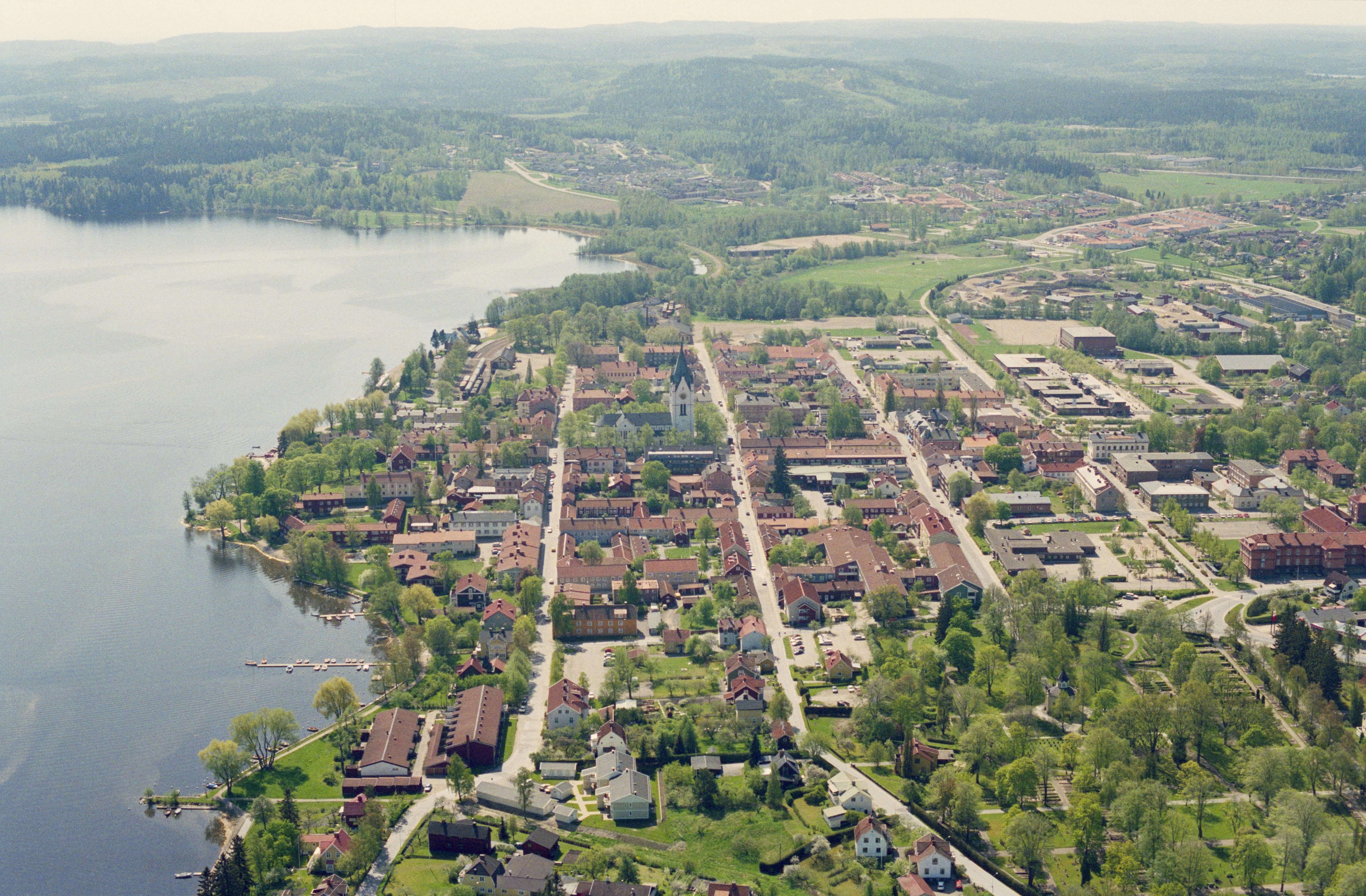 Beskrivning: Nora stad vid Hagbyån och Norasjön. Nora kyrka i bildens mitt. Stadslager RAÄnr Nora 164:1 i området vid kyrkan och Torget. Bilden är tagen mot (väderstreck): SSV
