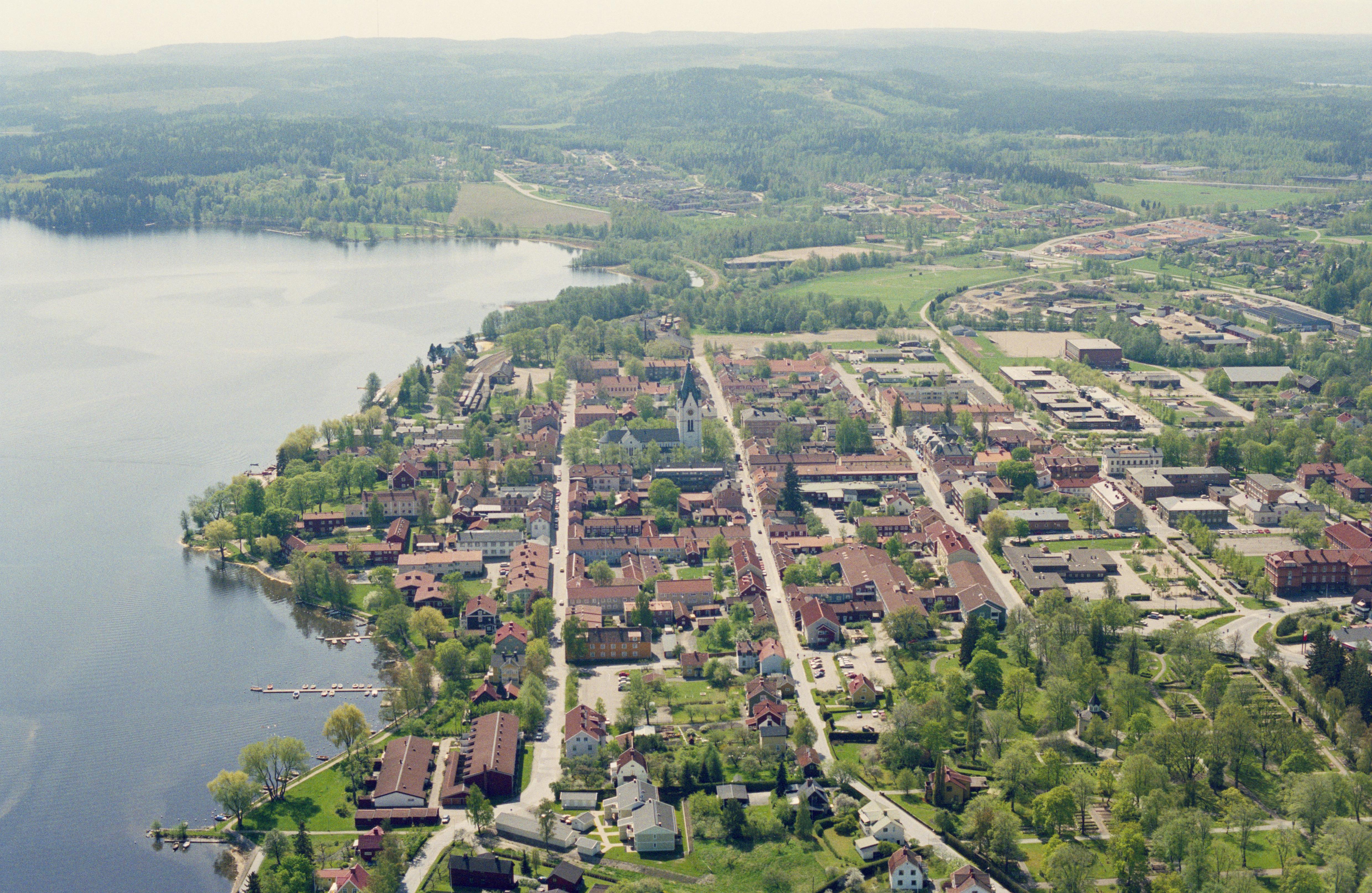 Beskrivning: Nora stad vid Hagbyån och Norasjön. Nora kyrka i bildens mitt. Stadslager RAÄnr Nora 164:1 i området vid kyrkan och Torget. Bilden är tagen mot (väderstreck): SSV