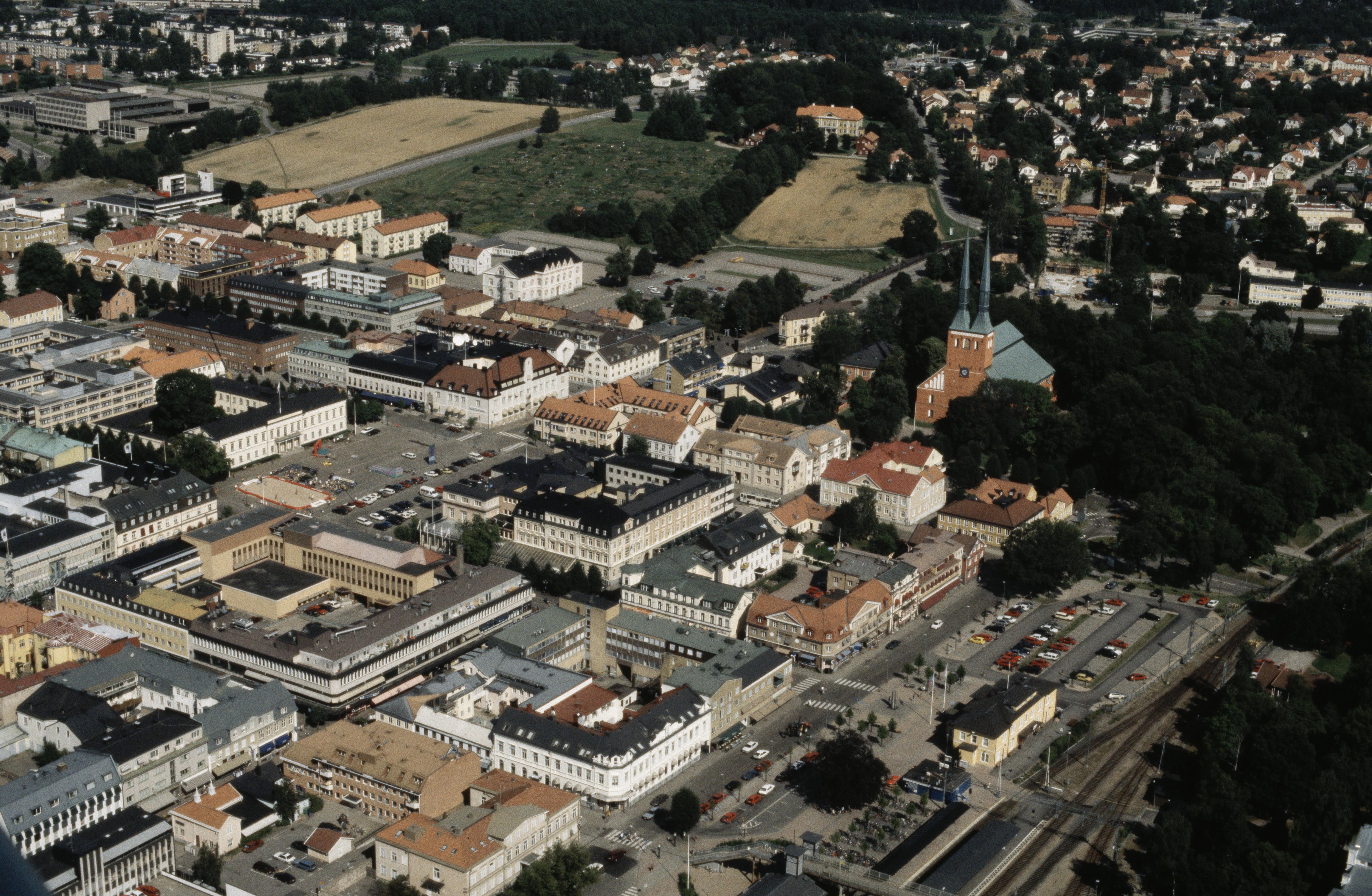 Beskrivning: Växjö stad. Växjö domkyrka till höger om bildens mitt. Bilden är tagen mot (väderstreck): NO