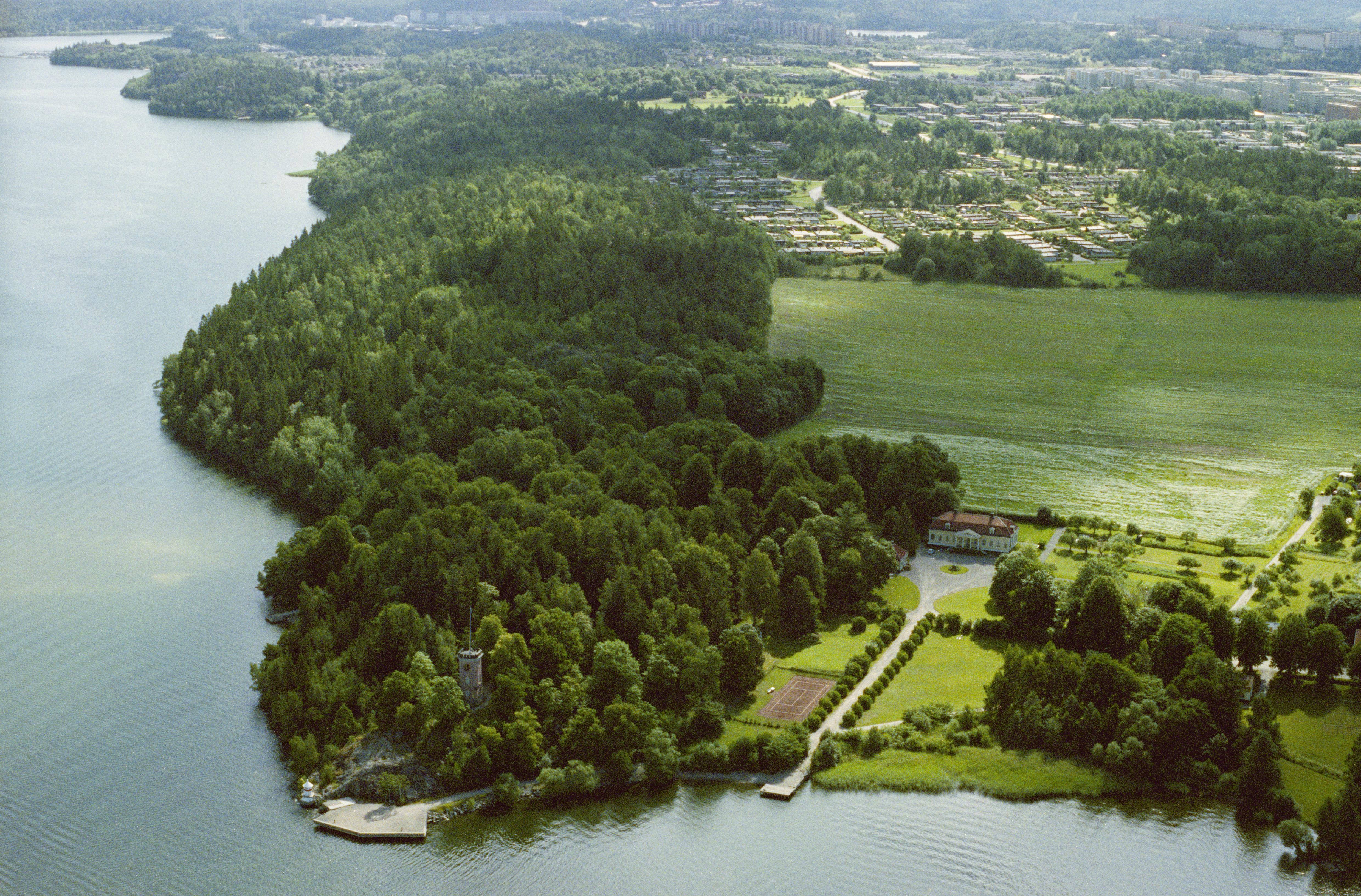 Beskrivning: Norsborgs herrgård RAÄnr Botkyrka 9:1 vid Rödstensfjärden i Mälaren. Till vänster om bildens mitt borg RAÄnr Botkyrka 7:1, gravfält Botkyrka 8:1 m.fl. I bildens övre del Norsborg och Hallunda mot Huddinge socken. Bilden är tagen mot (väderstreck): OSO