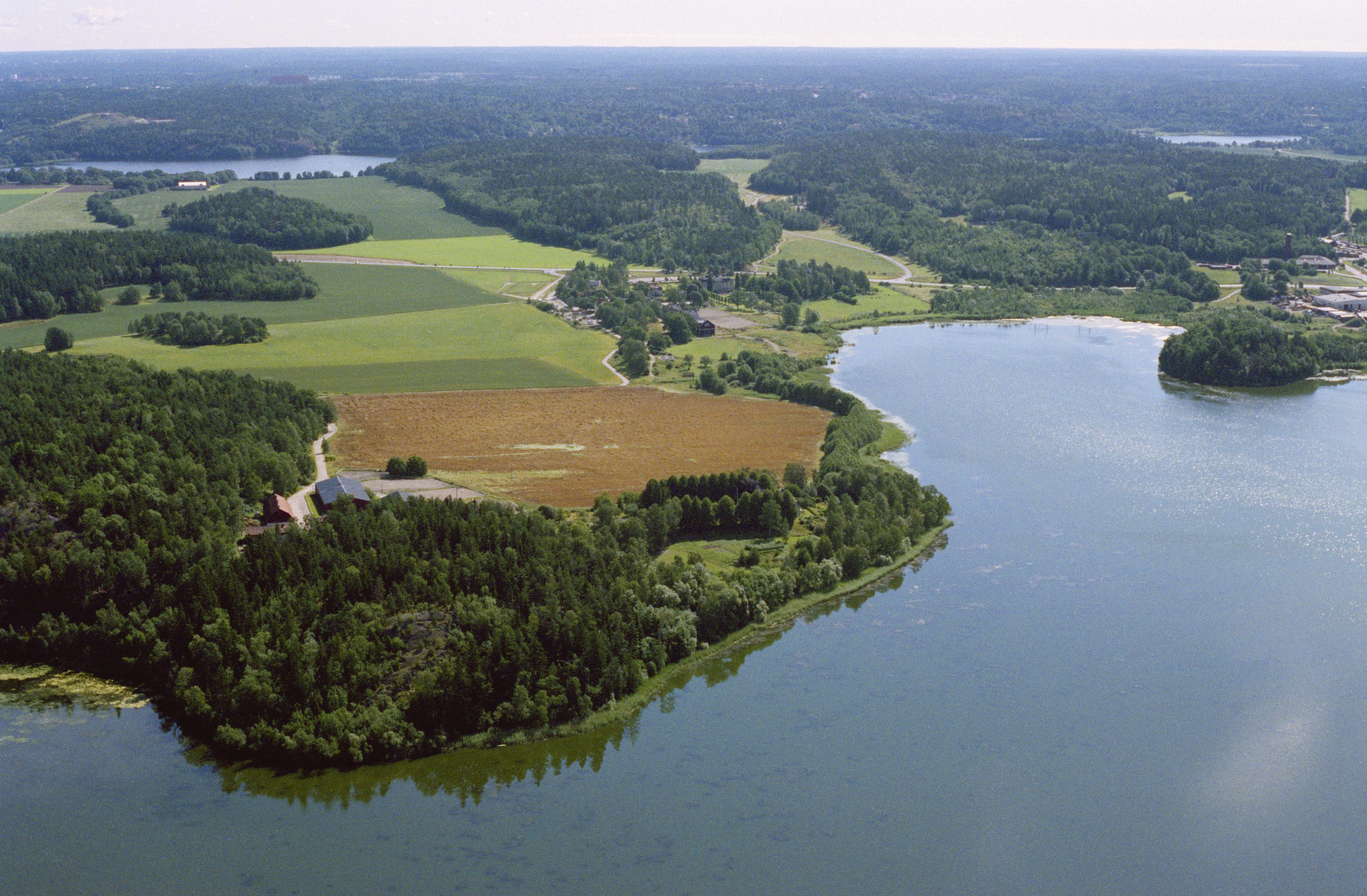 Beskrivning: Till vänster Skrävsta herrgård vid sjön Aspen. Under bildens mitt boplats RAÄnr Botkyrka 631. Vid bildens mitt Hågelby herrgård. Bilden är tagen mot (väderstreck): Ö
